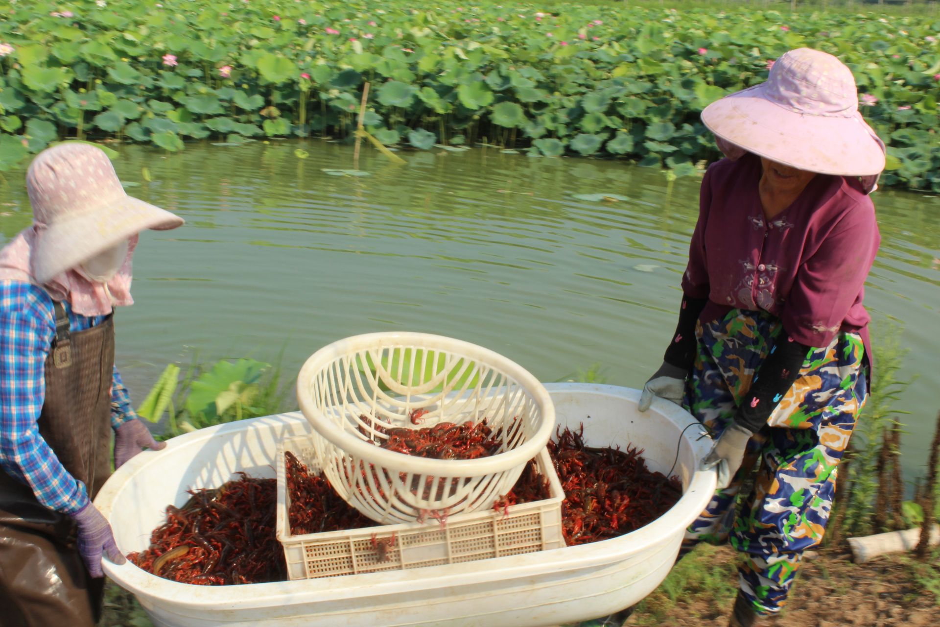 眼下正值小龙虾上市的旺季,近日淮上区沫河口镇石王村锦秀之莲家庭农场工人们正在捕捉小龙虾。近年来,该区鼓励农户采取藕虾混养立体种养模式,取得可观的经济效益。
