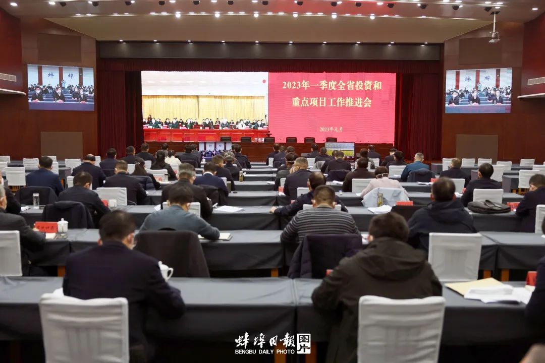 蚌埠新闻网讯(融媒体记者 顾楷)1月3日上午,2023年一季度全省投资和重点项目工作推进会召开。省委书记郑栅洁、省长王清宪出席会议并讲话。市领导黄晓武、马军、倪建胜、杨森、王庆武、葛锐、聂冬、吴永彬、张铭、潘君齐、乌兰其其格,市政府秘书长刘宗文在蚌埠分会场参加。