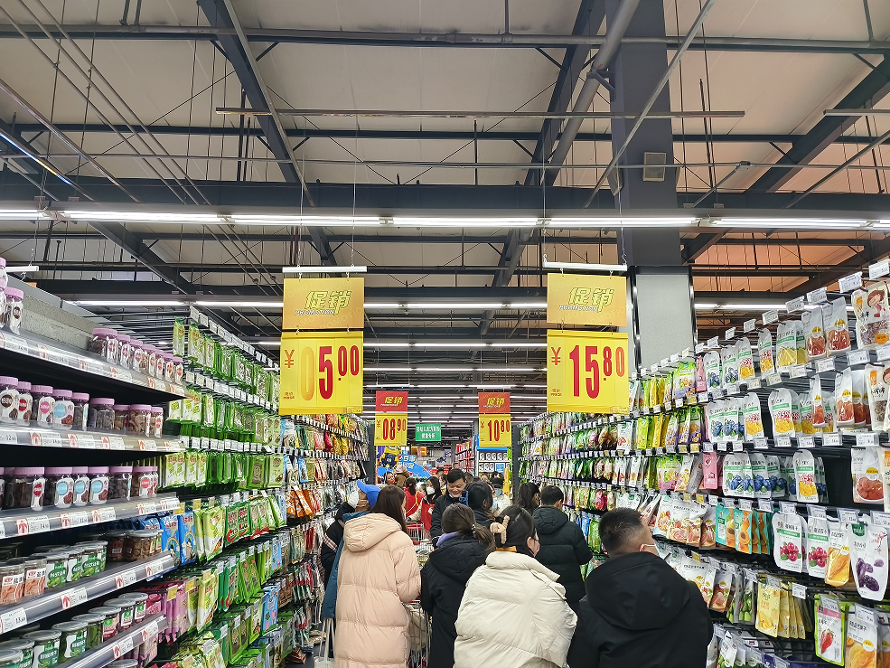 不仅是餐饮市场,零售消费市场也变得热闹起来。节日期间,蚌埠市的大型超市、百货商店相继开展了春节促销活动,各商贸市场也挂起了红灯笼,人们忙着扫码、问价,好不热闹。
