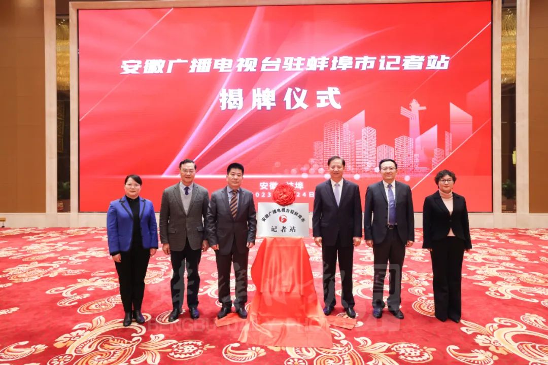 蚌埠新闻网讯 2月24日上午,安徽广播电视台驻蚌埠记者站揭牌。市委书记黄晓武,安徽广播电视台党委书记、台长、总编辑吴文胜出席揭牌仪式并为记者站揭牌。安徽广播电视台党委委员、副台长张阿林,市委常委、宣传部长郭鹏出席。