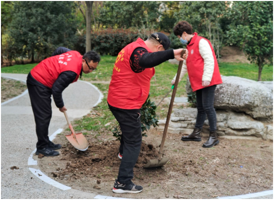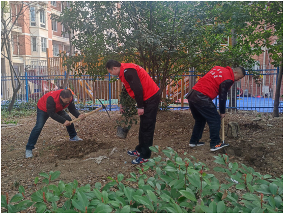 同时,志愿者们在沁雅花园、凯旋城两个小区开展植树补绿活动。活动中,志愿者们手拿工具,开始挖坑、栽苗、培土、浇水,每一道工序大家忙而不乱地认真完成。