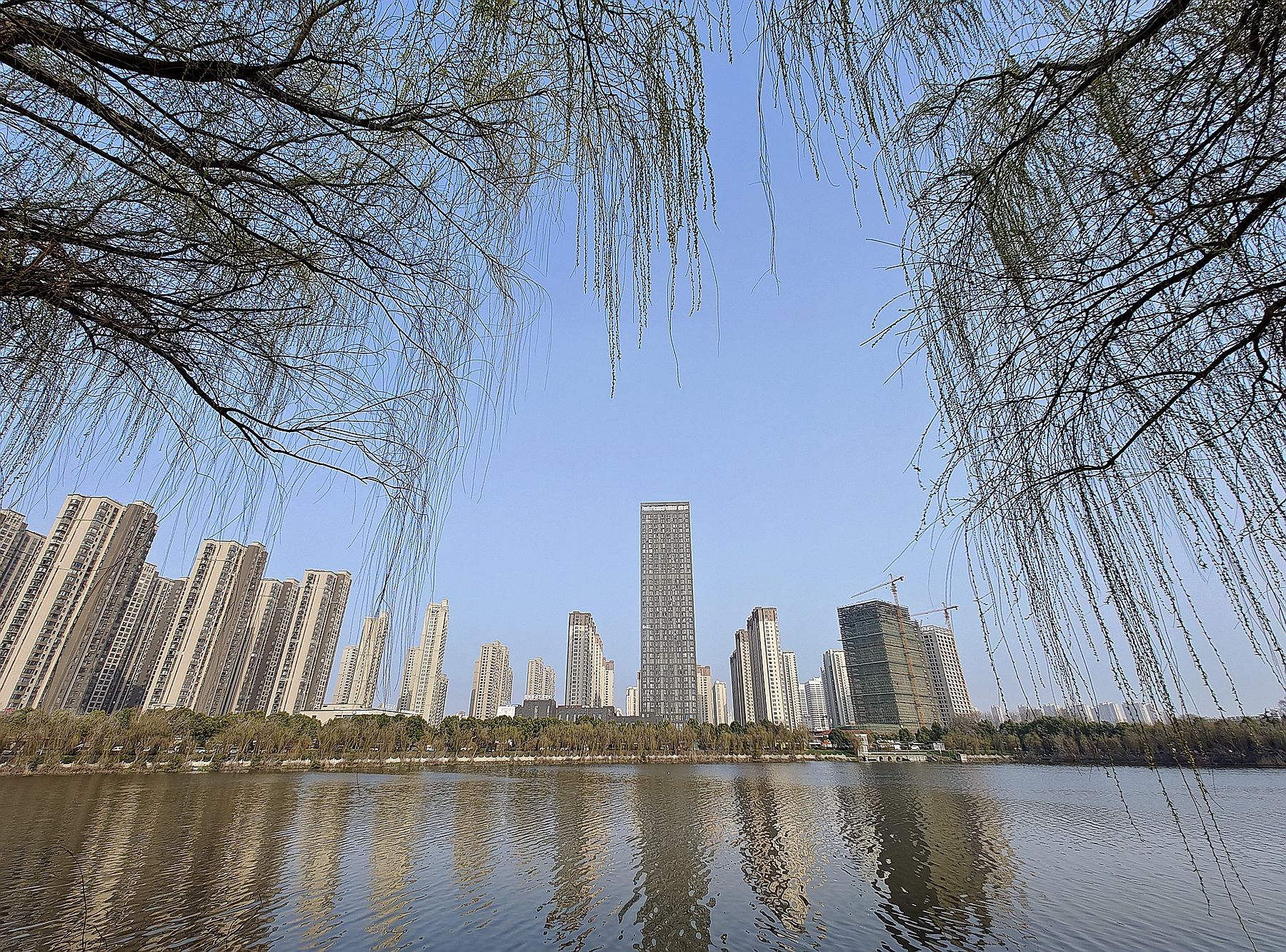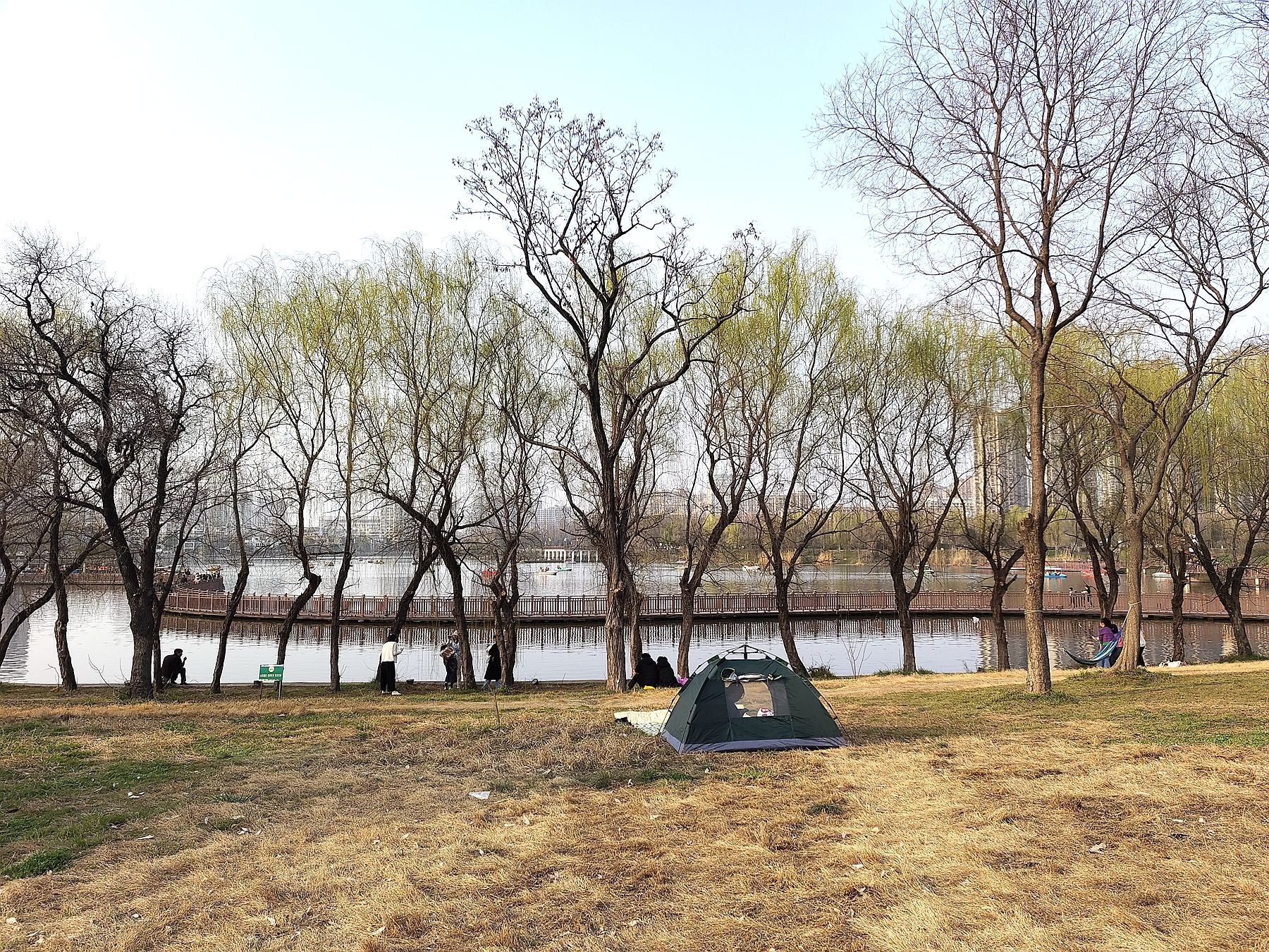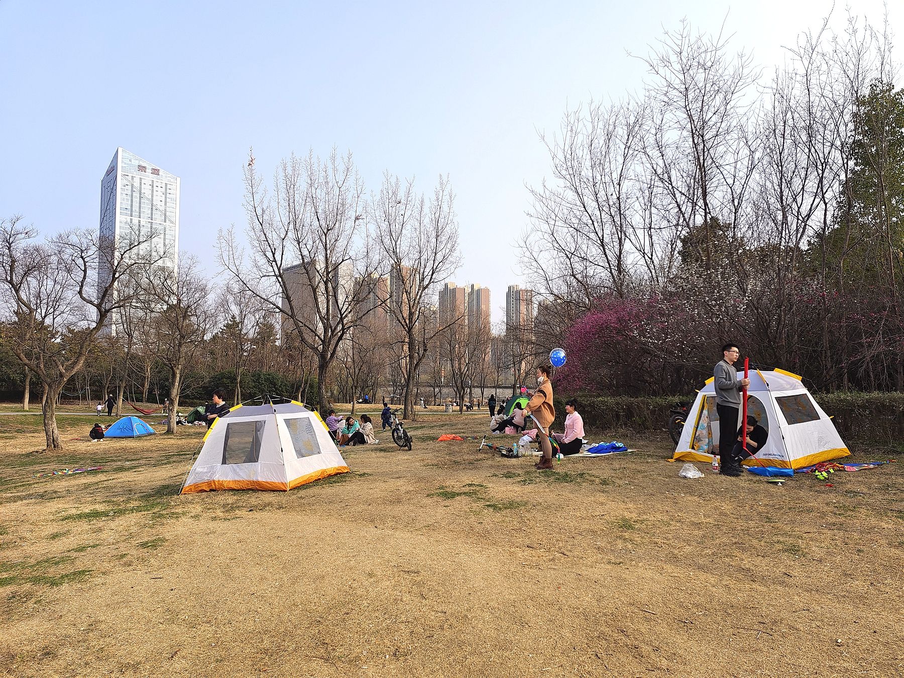 周日,蚌埠市阳光明媚,气温回升,许多市民走出家门,来到公园,搭起帐篷,享受春光,放飞心情。(沈林成 摄)