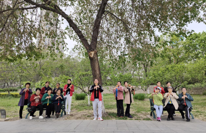 老年大学的老师带着学员们来到户外学习葫芦丝,让学员度过