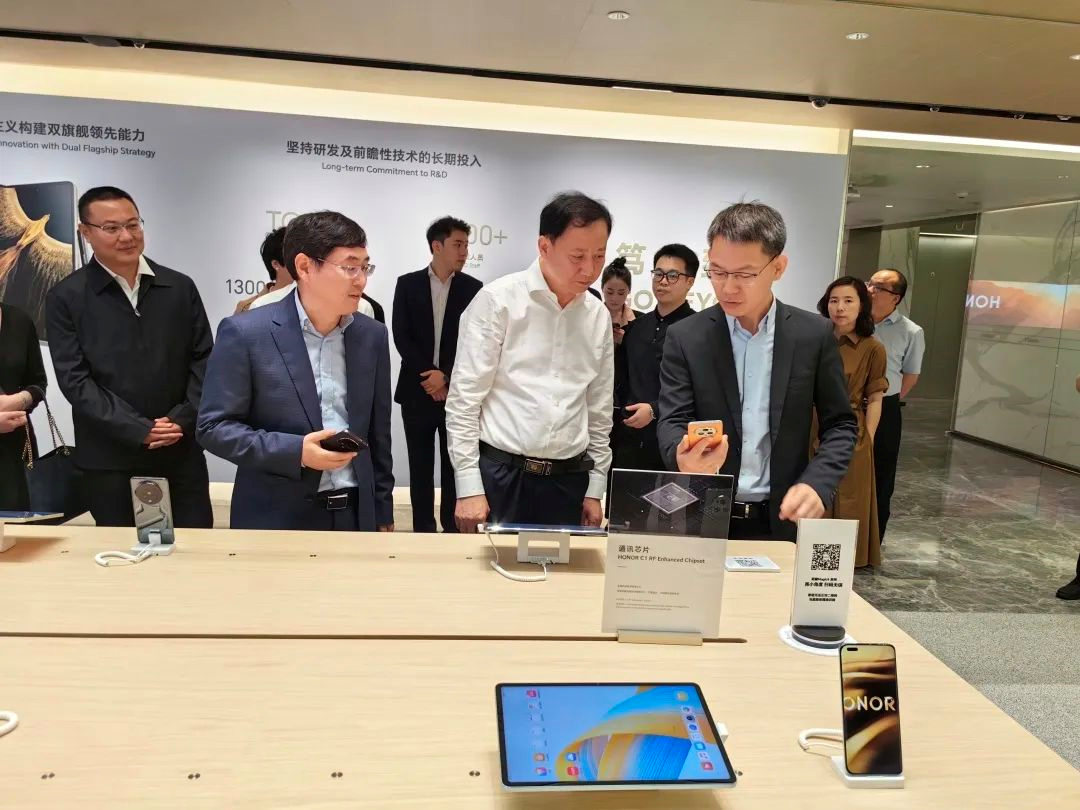 荣耀HONOR是全球领先的智能终端提供商,致力于构建全场景、面向全渠道、服务全人群的标志性科技品牌。在荣耀终端有限公司,黄晓武详细了解荣耀创新研发、产业布局等情况。在与荣耀流程IT与质量运营部总裁马兵座谈交流时,黄晓武诚挚邀请企业来蚌参观考察、投资兴业。他说,当前,蚌埠正坚持创新驱动、招商带动“两动”并进,新型显示、智能传感等产业呈现集群发展态势。希望荣耀发挥领军企业的龙头带动作用,与蚌埠进一步加大合作力度,带动更多产业链上下游企业布局蚌埠,推动形成良好产业生态。