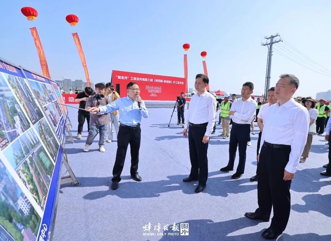 开工动员会开始前,黄晓武、马军等市领导结合项目展板详细听取工程介绍。黄晓武指出,滨河南路工程是一项民生工程、民心工程,对于完善城市路网布局、提升城市防洪标准、优化淮河生态环境等具有重要意义。要精心规划设计,进一步优化滨河南路下穿朝阳路桥、京沪铁路客运线、解放路桥等重要节点,发挥好项目的整体效应,全力保留城市记忆,为市民提供更多城市开放空间,促进文、旅、商深度融合。要强化施工保障,树牢“一盘棋”思想,确保征迁工作平稳有序按时完成,着力解决项目推进过程中遇到的堵点和难点问题,为施工建设创造良好环境。要加快工程推进,倒排工期,挂图作战,在保证工程安全质量的前提下,尽快竣工通车,让全市人民早日享受工程建设成果。