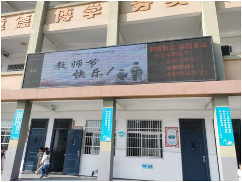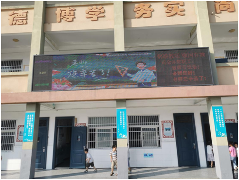 为教师亮灯,提升教师社会地位。仁爱中心小学通过 LED 大屏幕滚动显示“躬耕教坛,强国有我”“老师,您好!” “老师,您辛苦了”“教师节快乐!”等字幕,潜移默化的在小学生心里种下尊师重教的种子。
