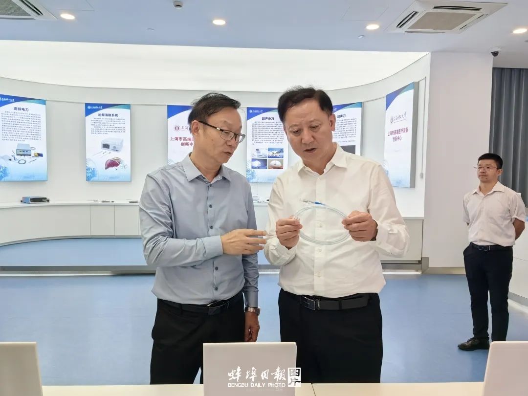在上海理工大学,黄晓武走进上海市高端医疗装备创新中心、机器智能研究院等地,详细了解医疗装备创新研发、产业化等情况,并与上海理工大学校长丁晓东、上海市高端医疗装备创新中心主任刘平举行工作座谈,就在蚌埠共建先进医疗装备智造产业园等事项达成系列共识。