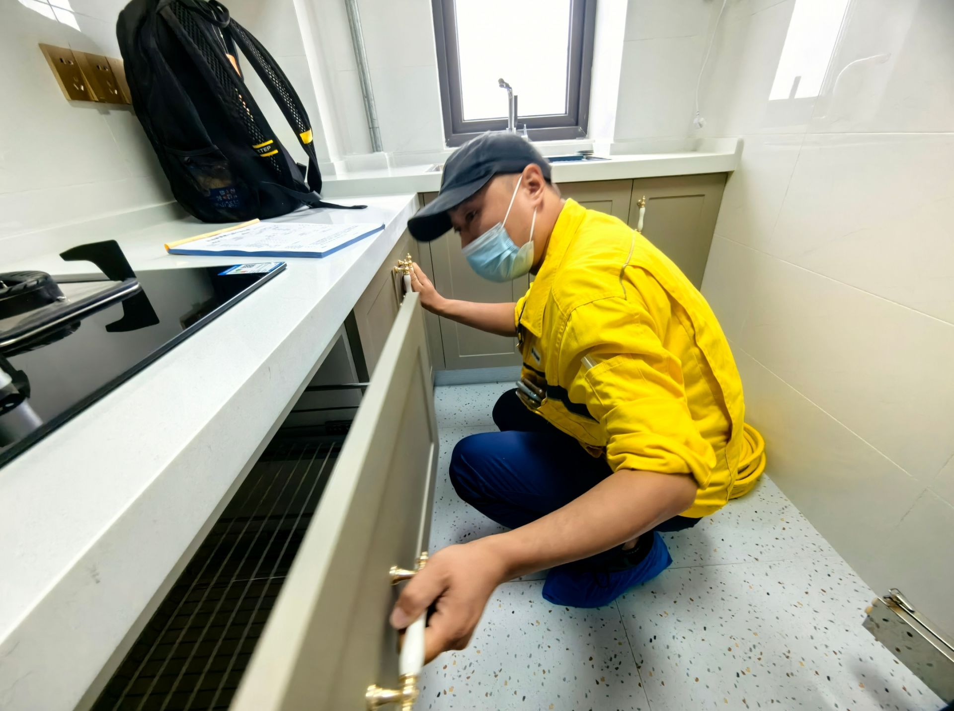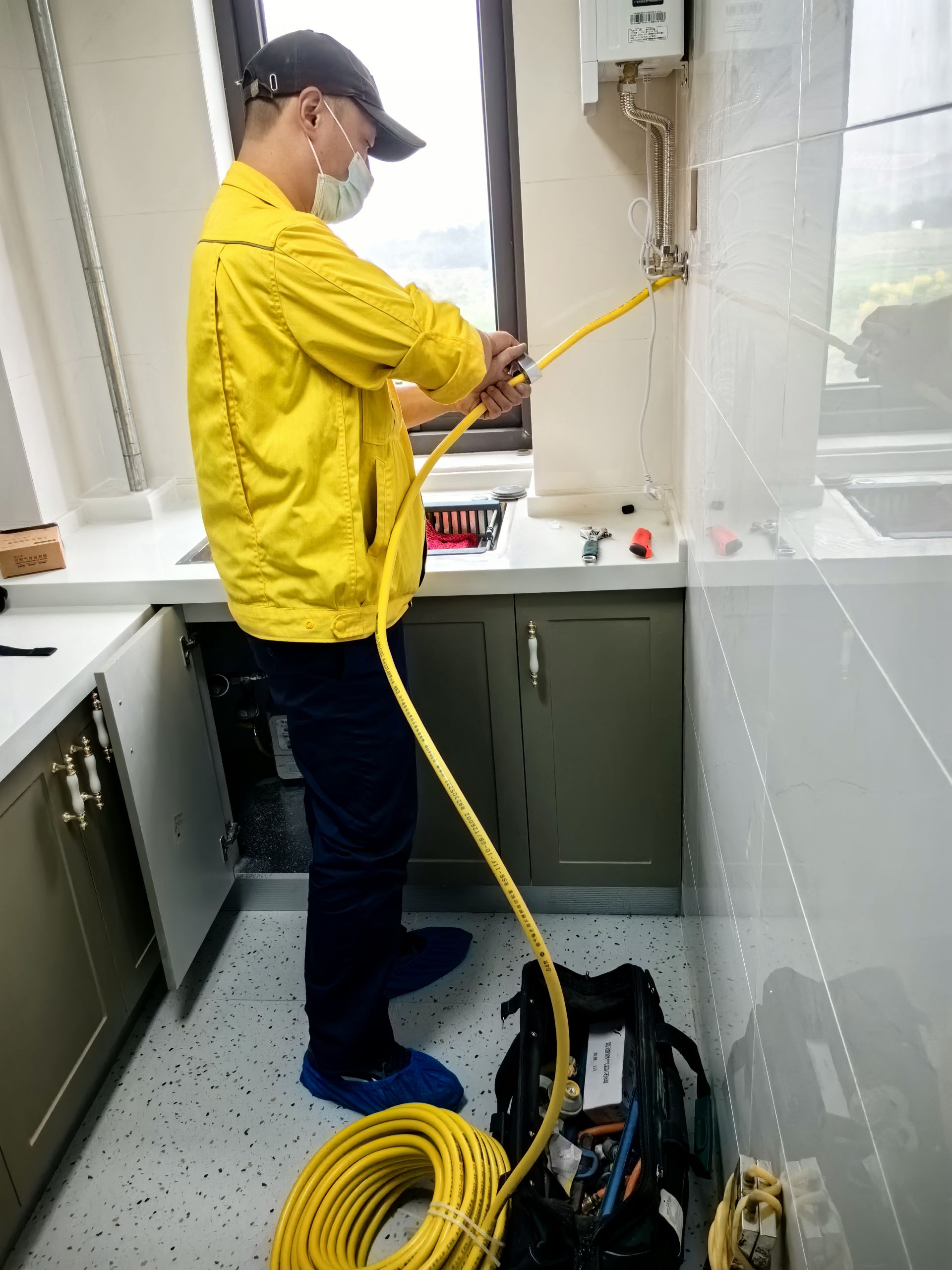 山水宸苑小区业主们刚刚入住,用气是生活的头等大事,所以张璨女士一家对于杜云龙上门来开通燃气非常得高兴。尽管张女士表示不需要穿鞋套,可是杜云龙还是坚持穿上了鞋套,并将自己的工具包和背包都放在厨房角落的地上。