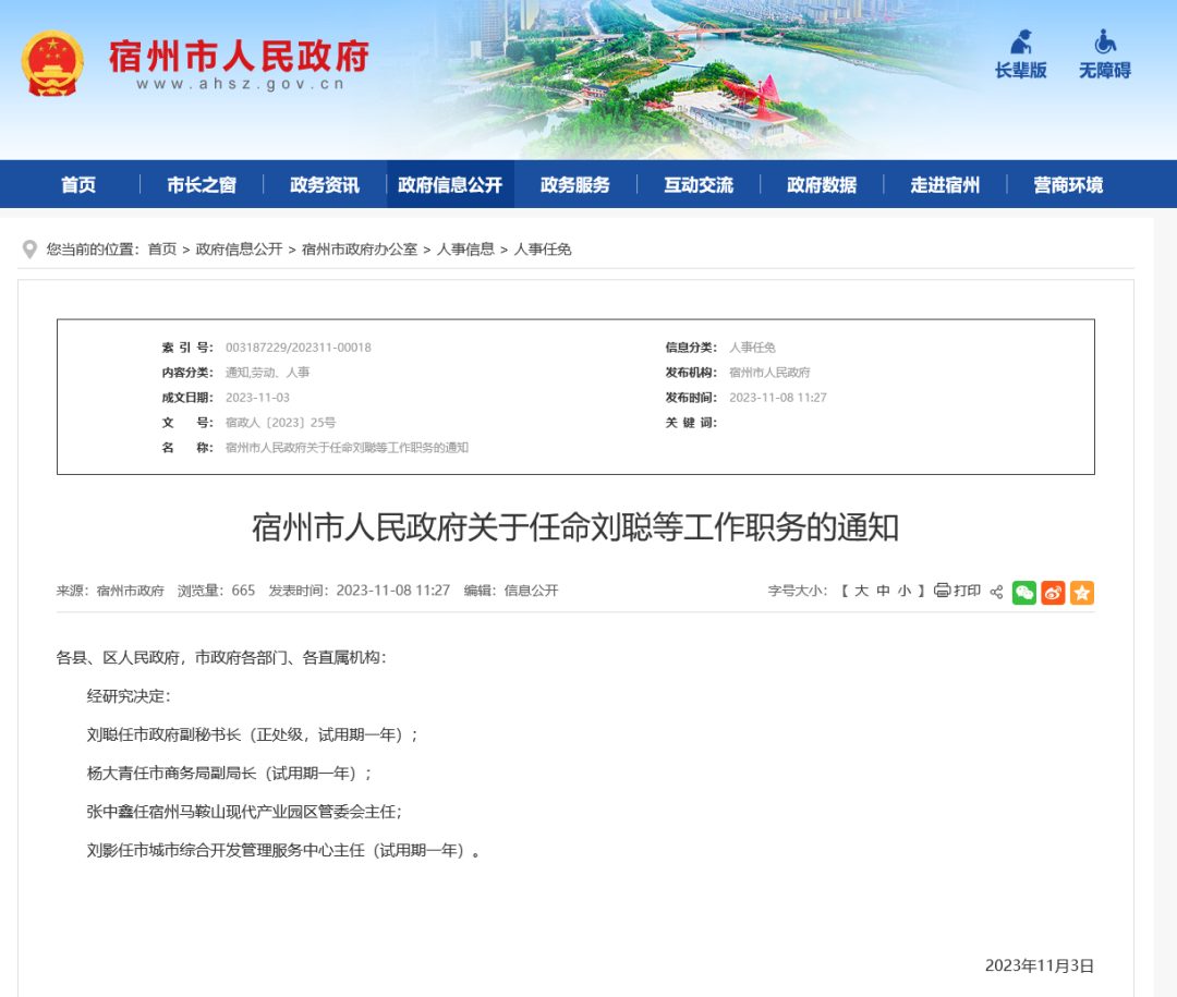11月8日,宿州市政府发布关于任命刘聪等工作职务的通知。其中,经研究决定:张中鑫任宿州马鞍山现代产业园区管委会主任。