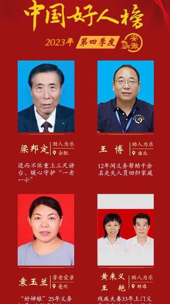 蚌埠发布客户端讯 好人就在身边。2024年1月31日下午,中央文明办发布2023年第四季度“中国好人榜”,安徽13人光荣上榜。上榜好人中,有蚌埠这对夫妻——33年歇上门义务理发过万次、扶残助残为民服务不停歇的蚌埠市龙子湖区两站小区居民黄来义、王艳。