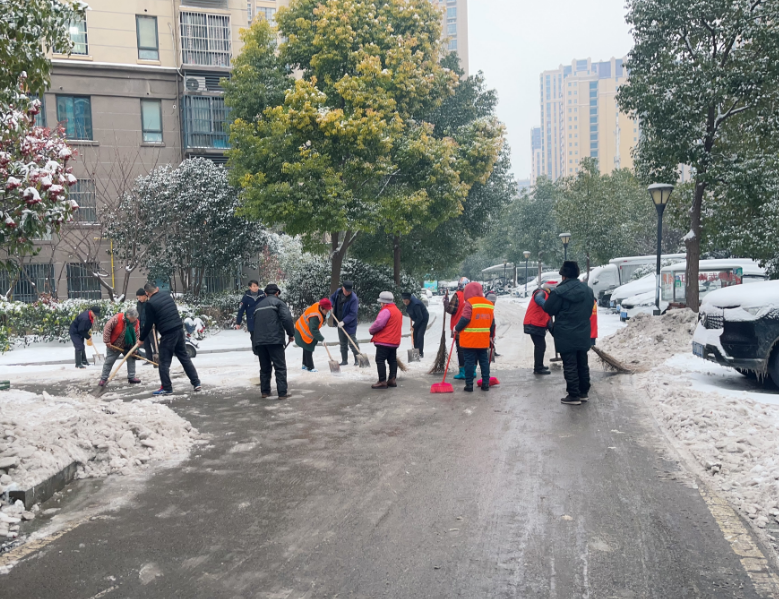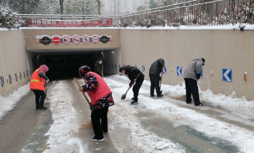面对多年不遇的雨雪冰冻天气,辖区内各小区物业想方设法,保障居民出行安全。在绿地世纪城小区,大家不畏严寒,相互配合,一个个忙碌的身影构成了雪中一道道风景线。“大雪不停歇,除雪的工作就不能停歇。”该小区物业工作人员郭忆龙表示,“这几天,物业人员全体出动,还请来了除雪车,大大提高了工作效率,清理积雪工程中还不忘提醒过路行人小心路滑,注意安全。目前,经过大家的共同努力,小区路面及行人道路上的积雪已被基本清扫干净,小区道路畅通无阻,确保了居民和道路行人的出行安全。”