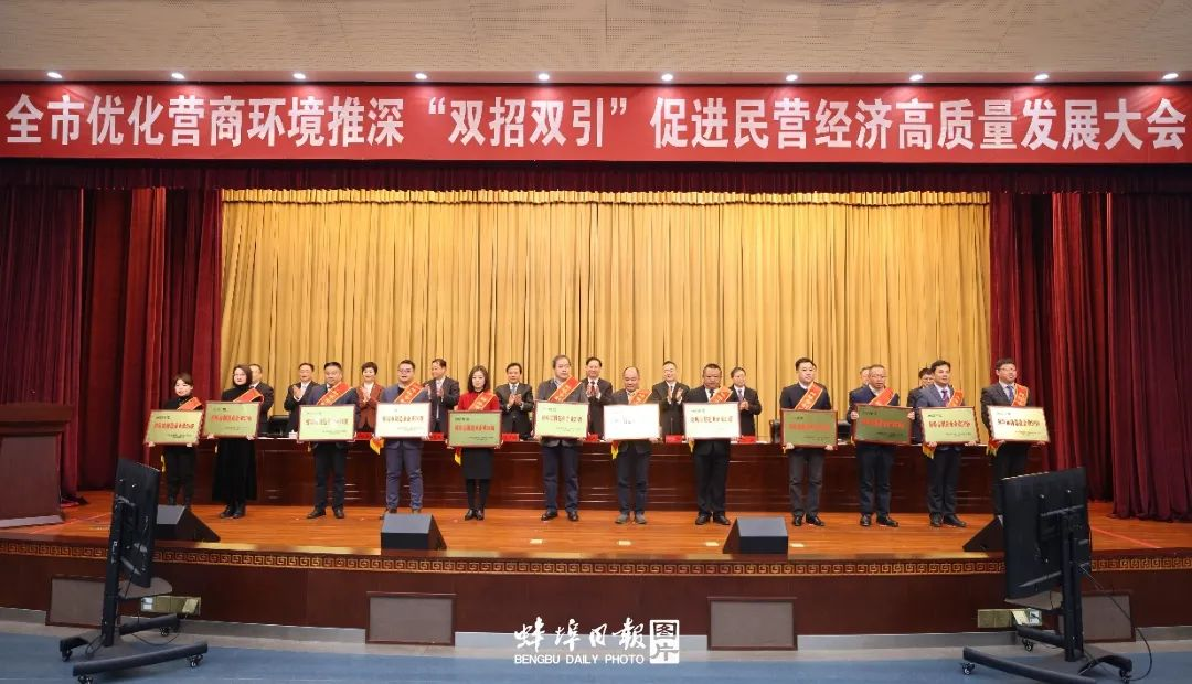 大会宣读了《关于表彰2023年度蚌埠市“双招双引”和项目建设先进集体和先进个人的决定》《关于表彰2023年度蚌埠市推进新型工业化城镇化建设先进集体和先进个人的决定》和《关于表扬2023年度蚌埠市企业税收贡献30强、制造业企业20强、农业产业化龙头企业10强、“专精特新”企业20强、现代服务业企业10强、个体工商户10佳的通报》。市领导为获奖单位和个人颁奖,并为11个招商分局授旗。