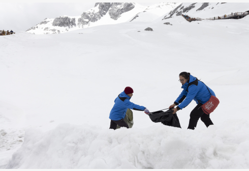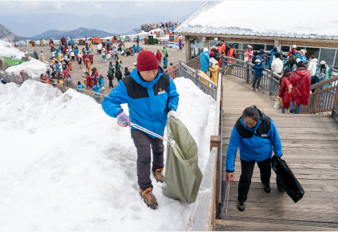 玉龙雪山冰川公园景区每天吸引上万名游客前来游玩。和德军和吕皓葳两人在这里工作已经八年多,守护着玉龙雪山这片净土。近年来,人们环保意识逐渐增强,和德军和吕皓葳看到越来越多的游客不再随手乱扔垃圾,觉得很欣慰。