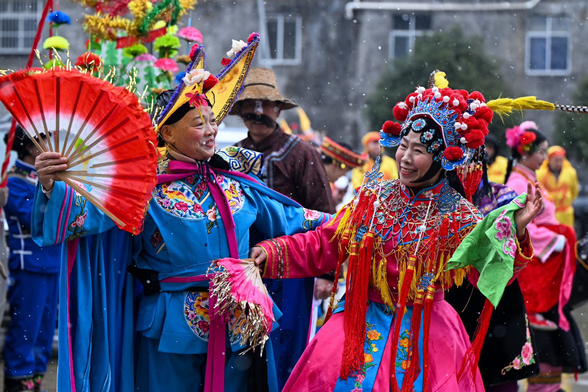 2月6日,在湖北省恩施州利川市柏杨坝镇,灯歌队队员在演出前穿戴衣饰。