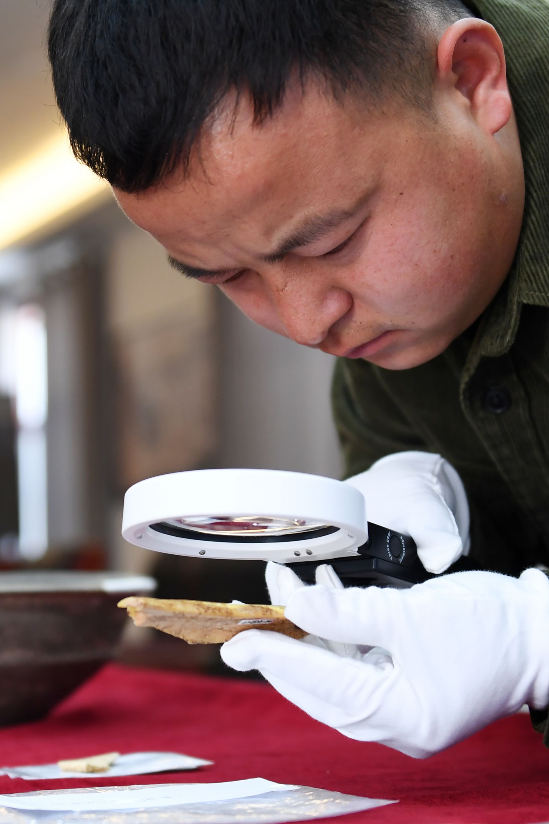 2025年2月25日,在位于陕西省宝鸡市的周原田野考古中心,陕西省考古研究院研究实习员闫永强在查看周原遗址出土文物。新华社记者 李一博 摄