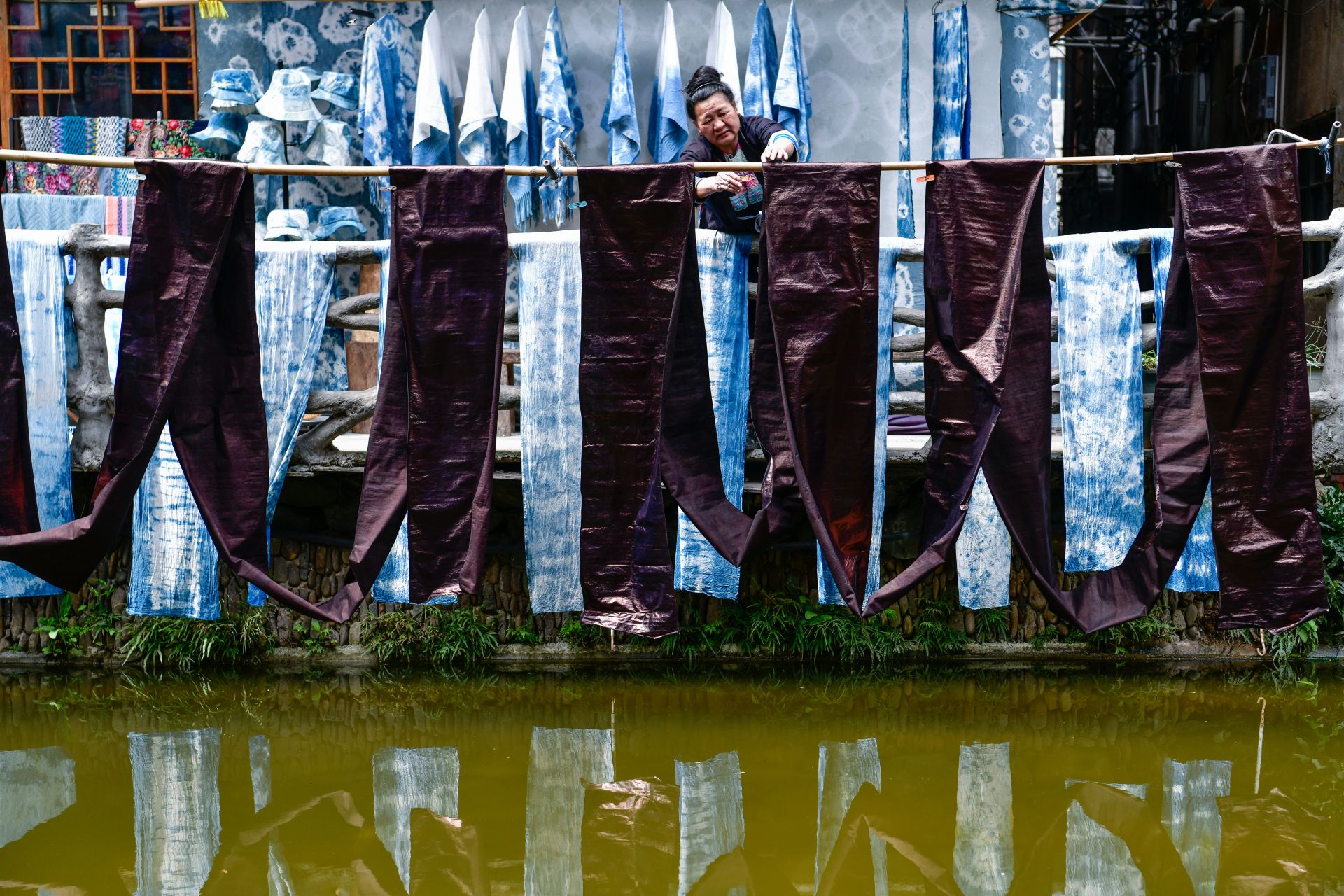 3月18日,村民在贵州省黎平县肇兴侗寨里晾晒侗布。
