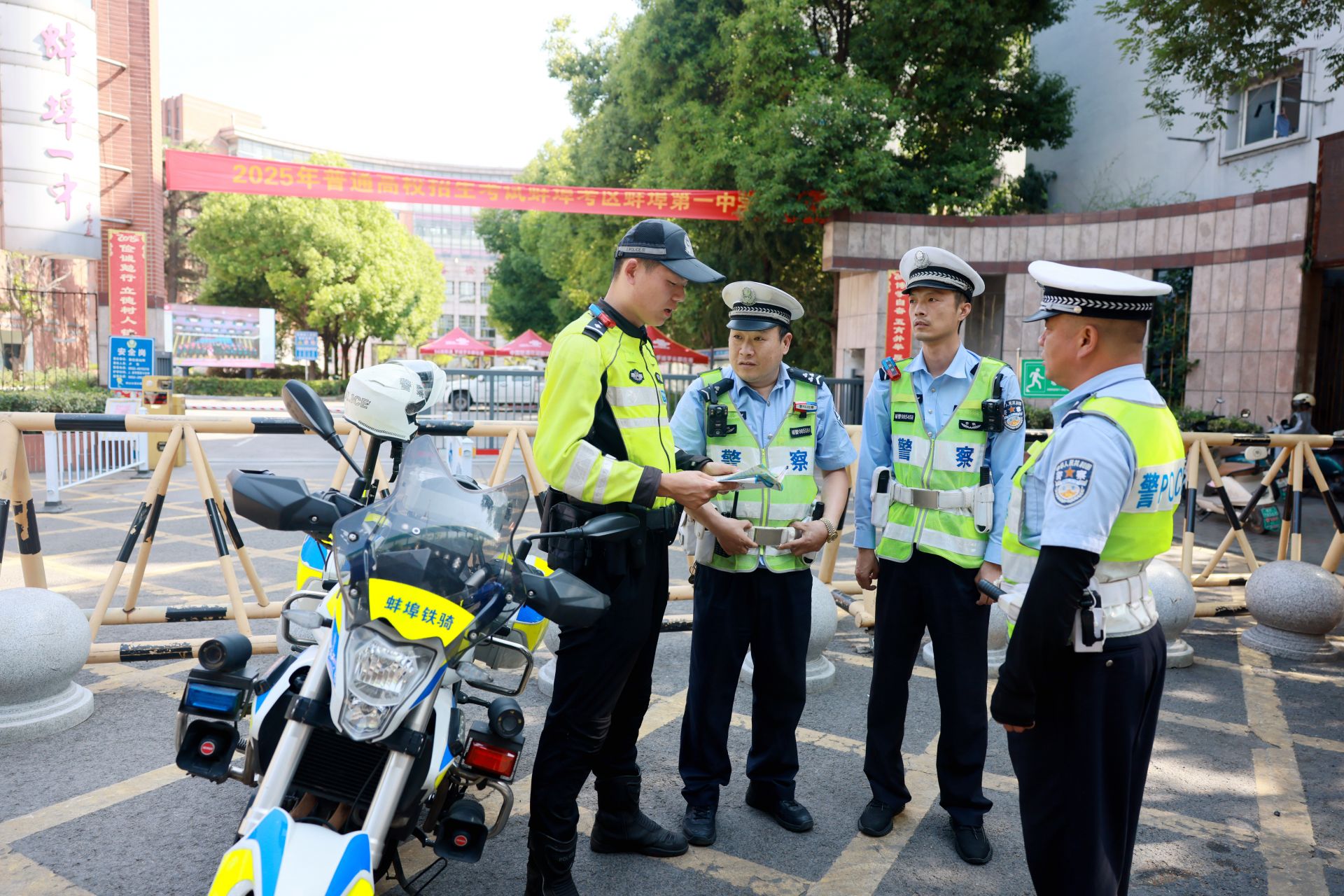 6月5日,蚌埠一中考点前,市公安局交警支队二大队民警、辅警商讨演练高考保障方案。2025年高考将至,为保障广大考生安全、顺畅赴考,我市交警部门加强考点周边及社会面道路交通秩序管理,严查各类交通违法行为,通过加强交通治理、警力部署、指挥调度和信息服务,全力投入高考护考工作,为考生创造良好的考试环境,确保高考期间全市道路安全畅通。