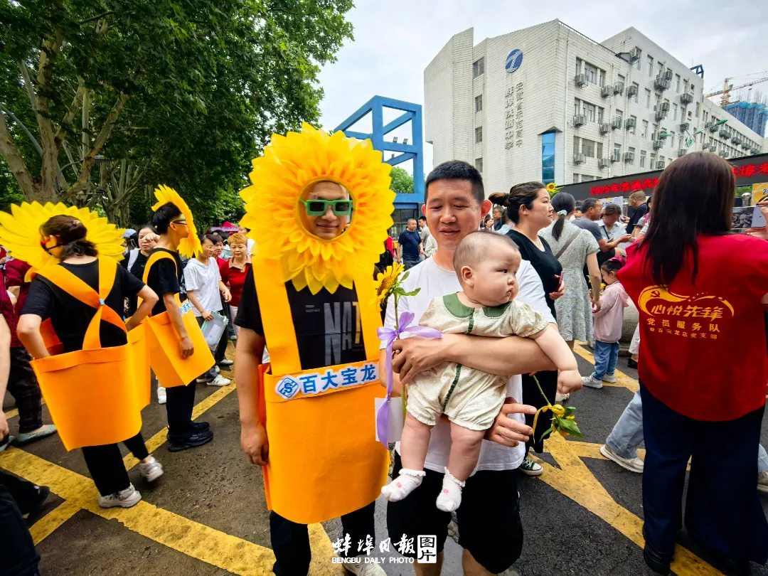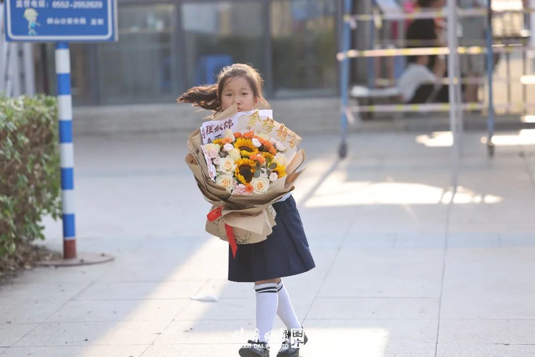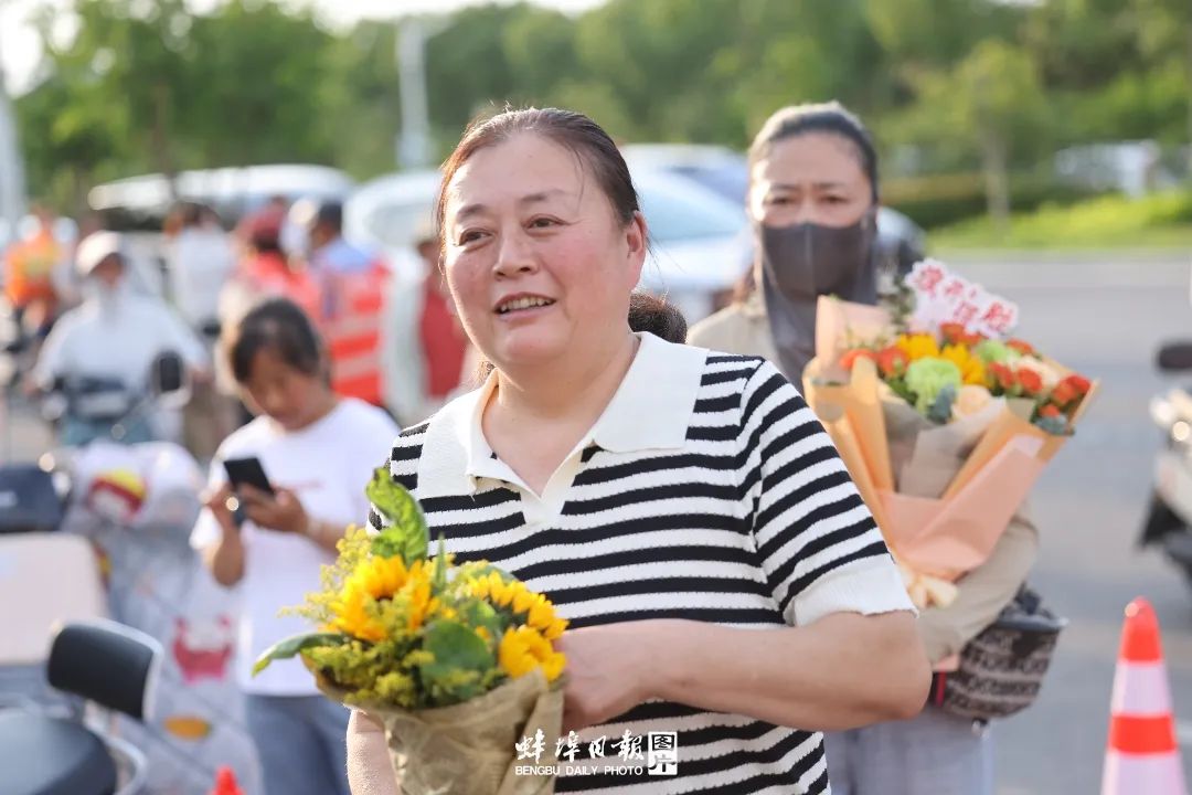 举着各类花束、礼物的家长视线统一