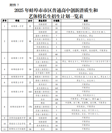 2025年,蚌埠市区开展创新潜质类和艺体类招生的学校,有蚌埠第一中学、蚌埠第二中学、蚌埠第三中学、蚌埠铁路中学、蚌埠第四中学、蚌埠第五中学、蚌埠第九中学、蚌埠田家炳中学、蚌埠京师实验高级中学、蚌埠博雅培文实验学校、蚌埠私立行知普通高级中学、蚌埠美佛儿学校等12所学校。