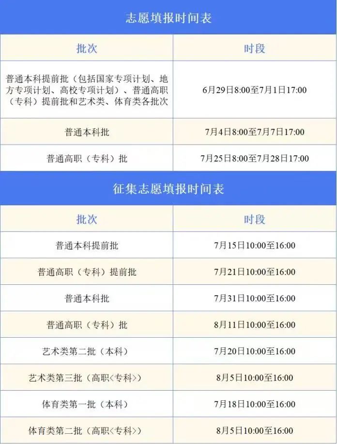 各科类各批次志愿(含录取期间征集志愿)均通过网络分时段填报,具体时间见下表: