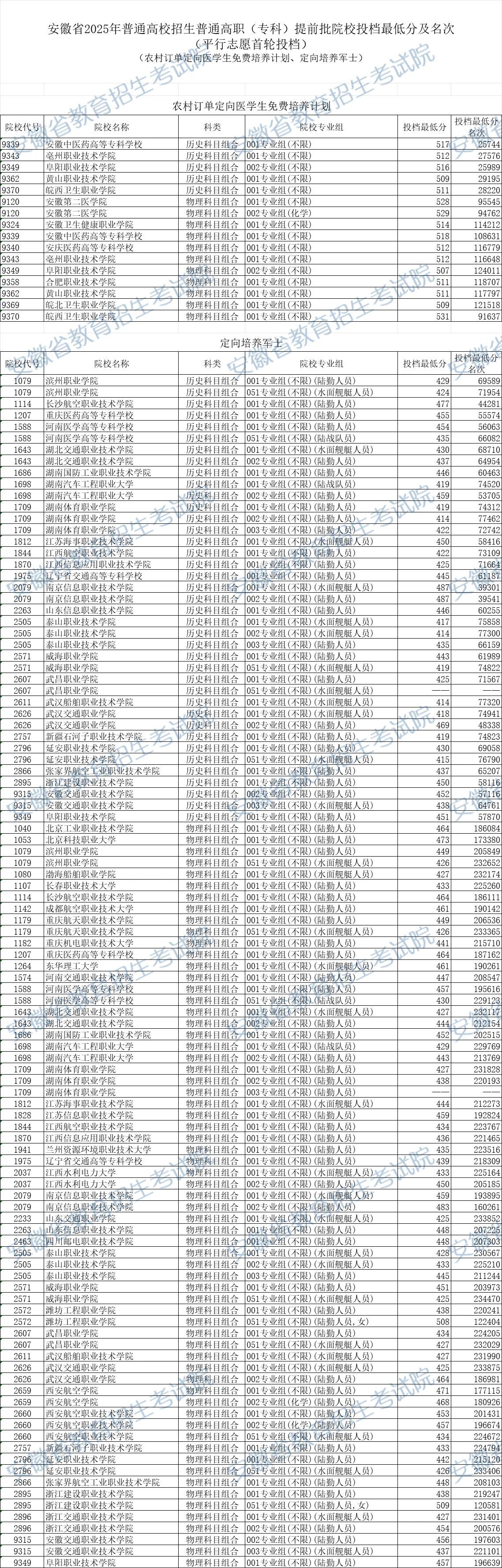 安徽省2025年普通高校招生普通高职(专科)提前批院校投档最低分及名次