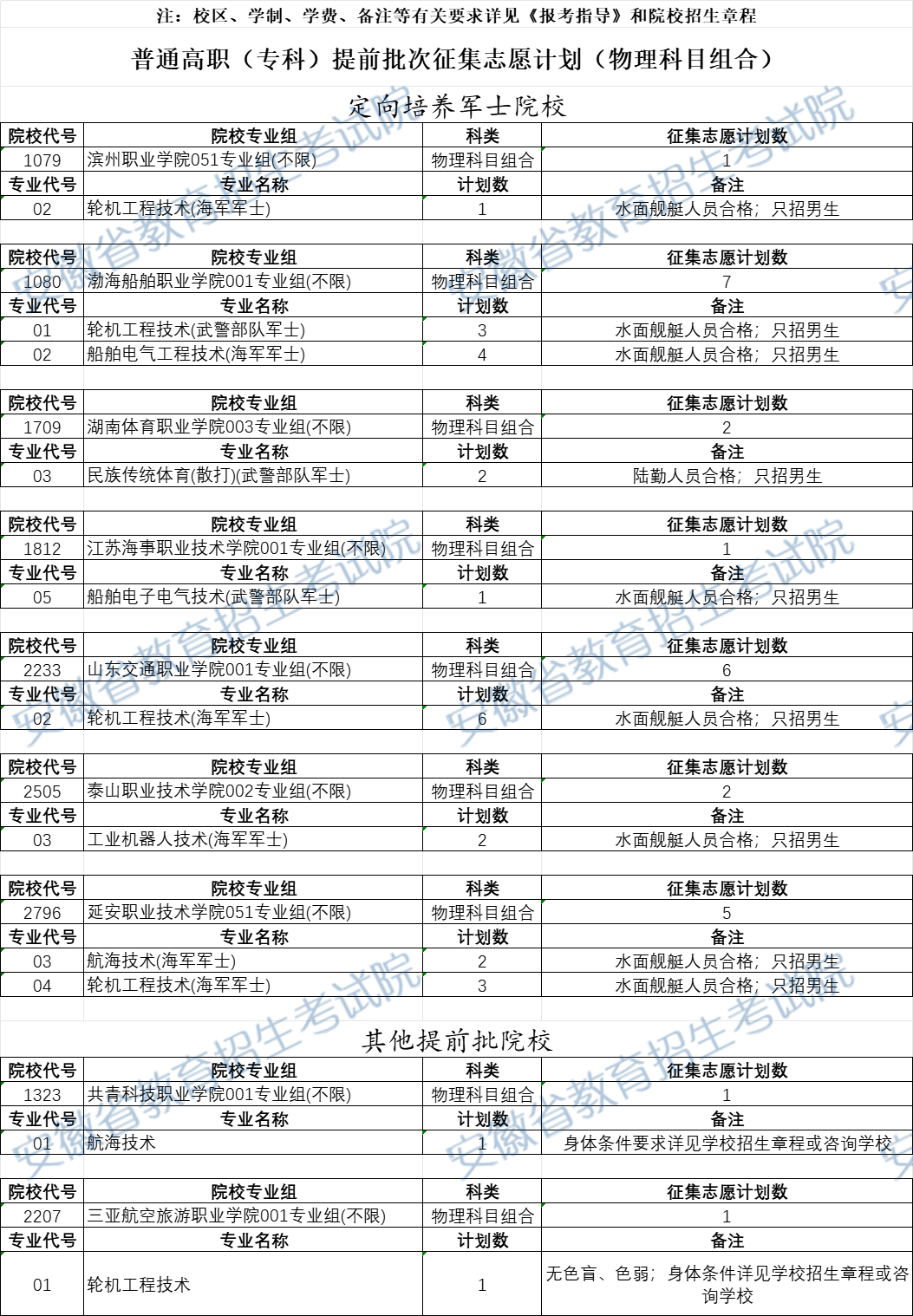 普通高职(专科)提前批次征集志愿计划(物理科目组合)