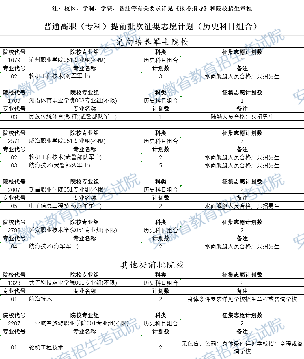 普通高职(专科)提前批次征集志愿计划(历史科目组合)