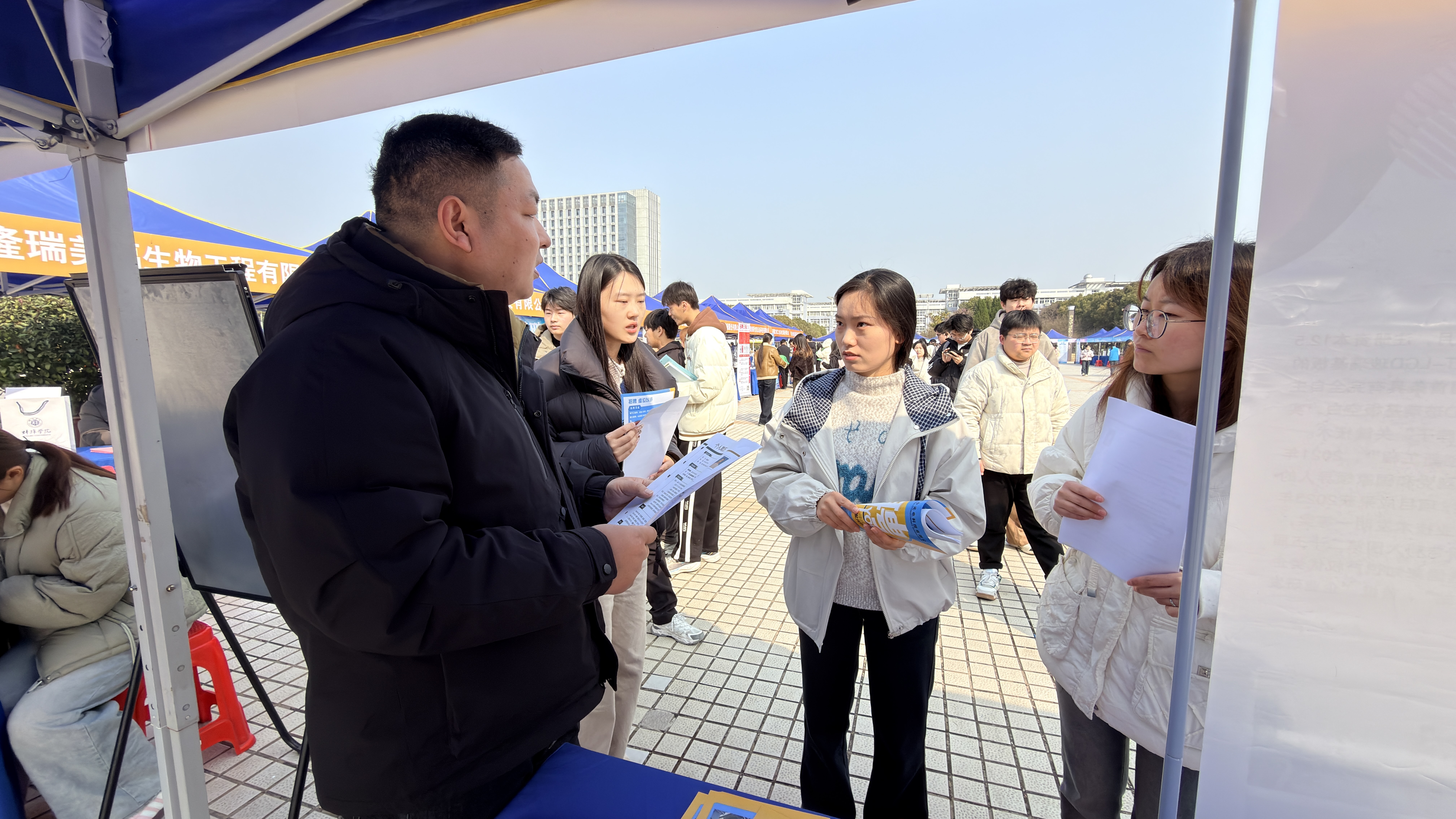 在招聘现场,各企业展台前人头攒动,应届毕业生手持精心准备的简历,与企业招聘负责人深入交流。来自六安的蚌埠学院大四学生马晓月,是材料科学与工程专业的学生,她在安徽丰原集团有限公司展台前仔细咨询岗位信息后,郑重提交了简历。“蚌埠近年来发展势头很好,丰原集团作为本地龙头企业,发展平台广阔,我希望能留在蚌埠,为这座城市的发展贡献自己的专业力量。”马晓月表示。安徽丰原集团有限公司人事专员陈志文介绍,此次企业带来了12个岗位,计划招聘120人,涵盖材料科学、生物化工、化学工程等多个专业领域。“我们非常重视高校人才培养,蚌埠学院的专业设置与企业发展需求高度契合,希望能通过此次活动吸纳更多优秀毕业生,为企业发展注入新鲜血液。”同样忙碌的还有安徽聚合新材料有限公司的招聘展台,来自滁州的环境生态工程专业学生周宇,在详细了解企业的发展前景和岗位要求后,向该公司投递了简历。“企业的环保类岗位与我的专业方向完全匹配,而且蚌埠的人才政策很有吸引力,我希望能在这里实现自己的职业理想。”周宇说。