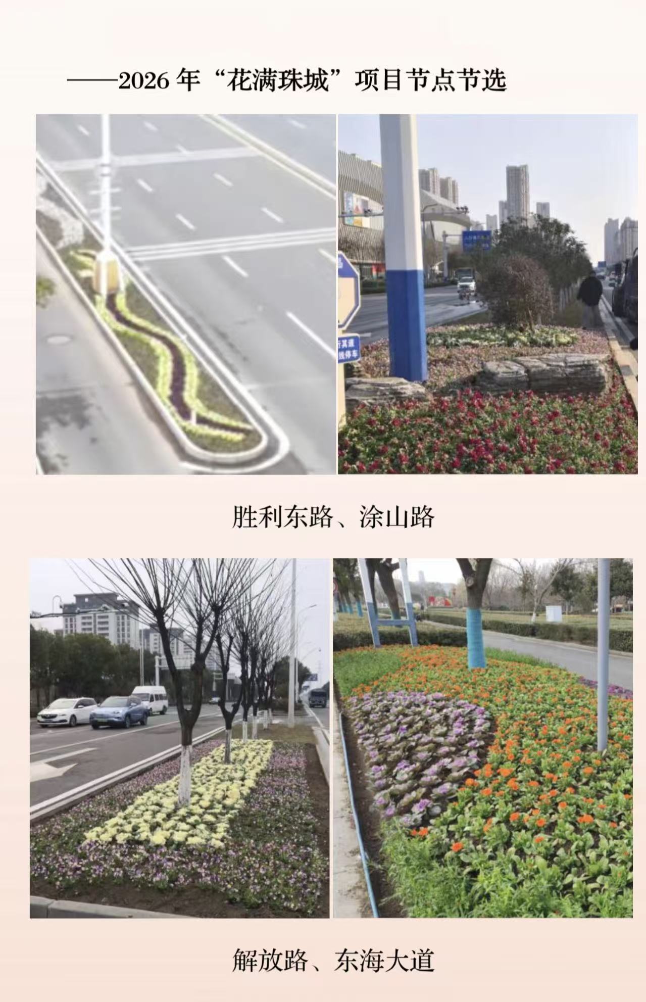 今年“花满珠城”行动目标为栽植80万株花卉,目前已顺利完成第一季度20万株栽植任务,解放路、宏业路、延安路等干道新增花卉节点近50处,全年计划点位累计达100处。后续,东海大道、涂山路等核心道路将持续丰富层次,推广郁金香、翠芦莉及市花月季,通过节庆绿雕、立体花境等多元形式,打造“四季有景、全城花开”的城市景观,让市民出行步步见花、处处有景。