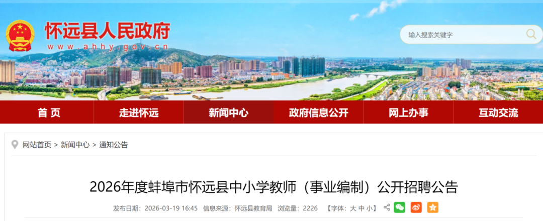 根据《关于进一步改进和完善中小学新任教师公开招聘工作的通知》(皖教〔2019〕29号)、《关于进一步完善中小学教师招聘制度落实市县中小学教师招聘主体责任的通知》(皖教秘师〔2020〕90号)等文件精神,为做好2026年度蚌埠市怀远县中小学教师(事业编制)公开招聘工作,现就有关事项公告如下: