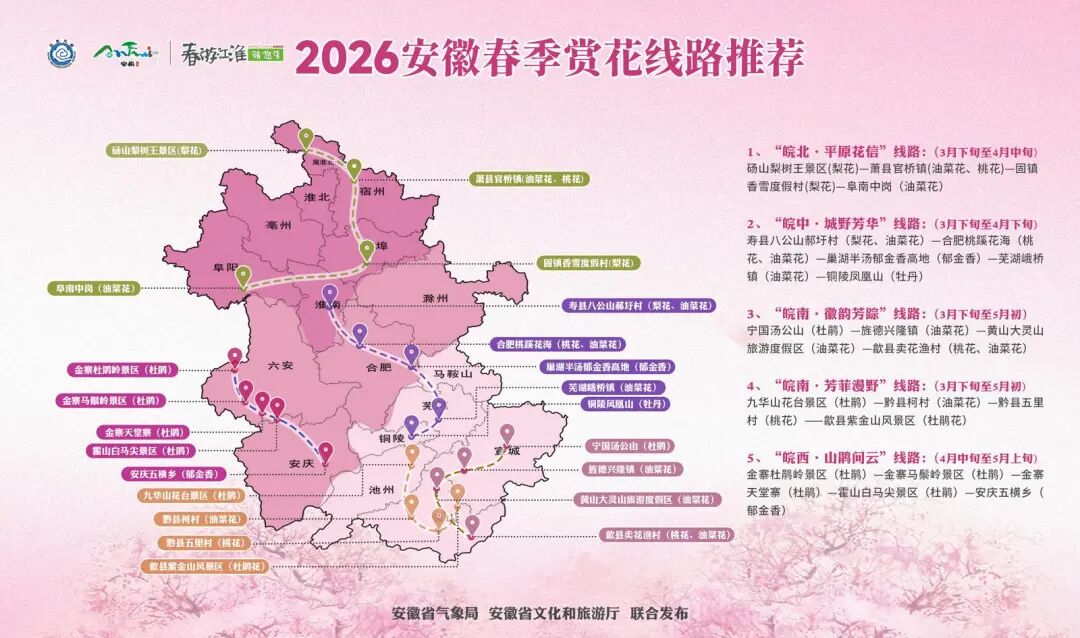 安徽省气象台与安徽省文化和旅游厅联合推出2026年安徽春季赏花线路推荐。