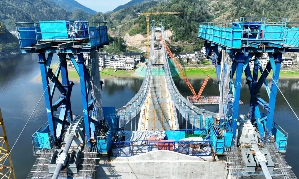 新安江小川大桥是安徽省首座隧道式锚定悬索桥,主桥采用320米单跨简支钢箱梁悬索桥,主梁采用流线型扁平封闭钢箱梁,共35个节段,总重量约2400吨。针对小川大桥所在位置山高谷深、路网狭窄,大型机械设备及大型构件材料钢箱梁陆路运输受限,施工方通过浮箱加拖船方式将钢箱梁沿新安江水路运输至桥位处,通过浮吊吊梁采取由两岸向跨中的吊装顺序。