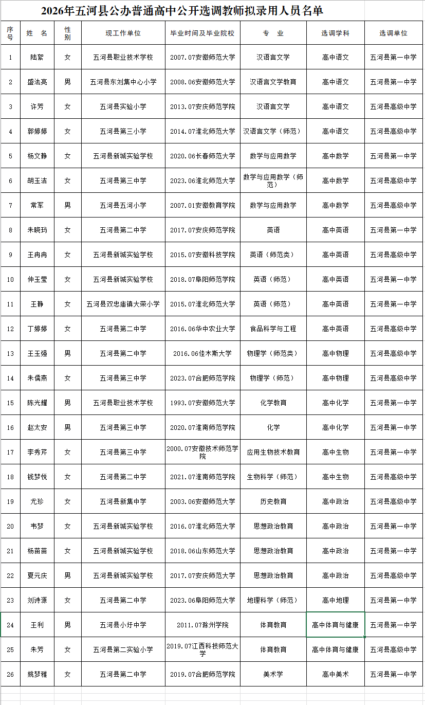 根据《2026年五河县公办普通高中公开选调教师公告》规定,现将2026年五河县公办普通高中公开选调教师拟录用人员予以公示(见附件)。