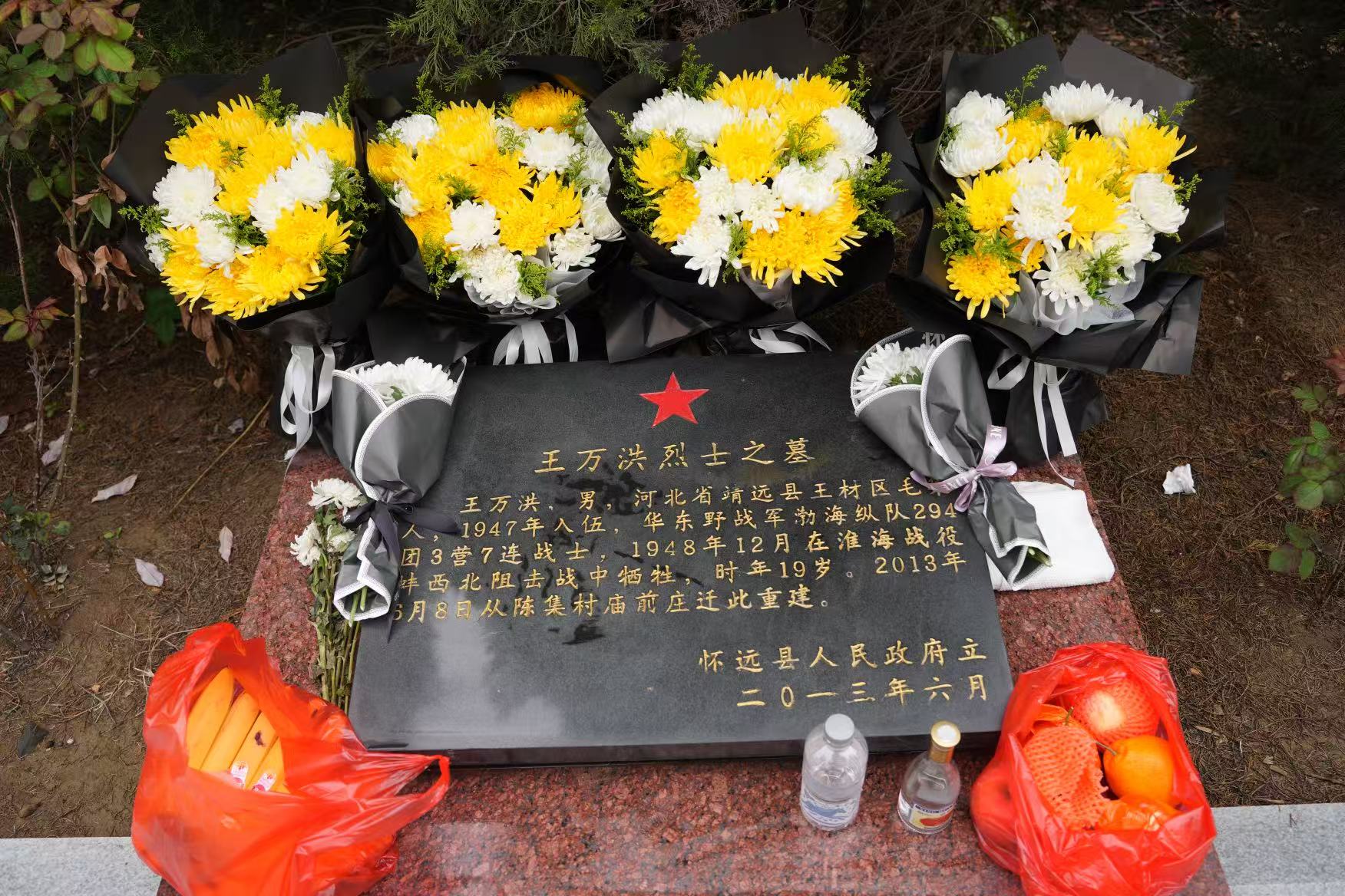 来自河北省沧州市盐山县的王新中、王寿伟一行四人,缓步走到烈士王万洪的墓前,双膝重重跪地,长久不起。他们小心翼翼摆上家乡的新酒,带着家族七十余载的牵挂,祭奠这位19岁便将生命献给家国的英雄。