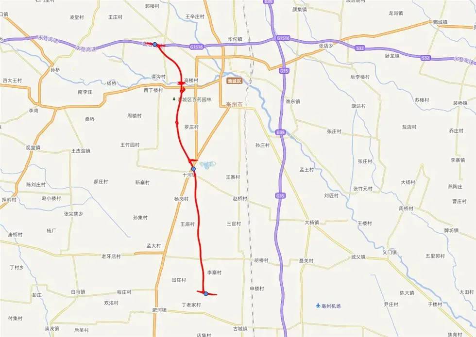 五河至亳州高速公路亳州西环段线路北起谯城区魏岗镇西南侧G1516盐洛高速,向南经十八里镇东、亳州市中心城区西、十河镇东、双沟镇东,终至淝河镇东北侧S62亳郸高速,全长40公里,采用双向四车道标准,设计时速120公里/小时,设互通立交4处、服务区1处,桥梁45座。