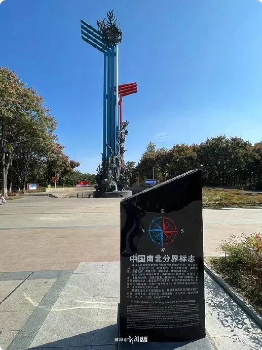线路首站,是龙子湖风景区。上午时分,景区内最热闹的当属南北分界线标志雕塑,游客们有序排队,争相与这座“一脚踏南北”的地理文化地标合影。