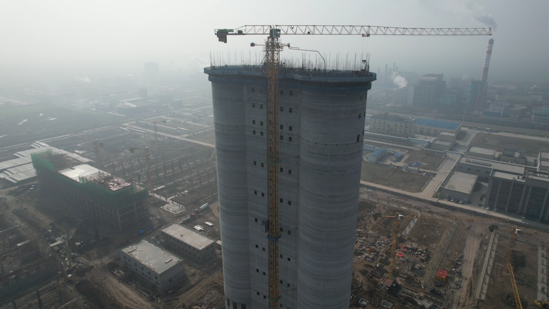 3月底,两座高118米的造粒塔拔地而起、顺利封顶,高耸在淮畔大地上。