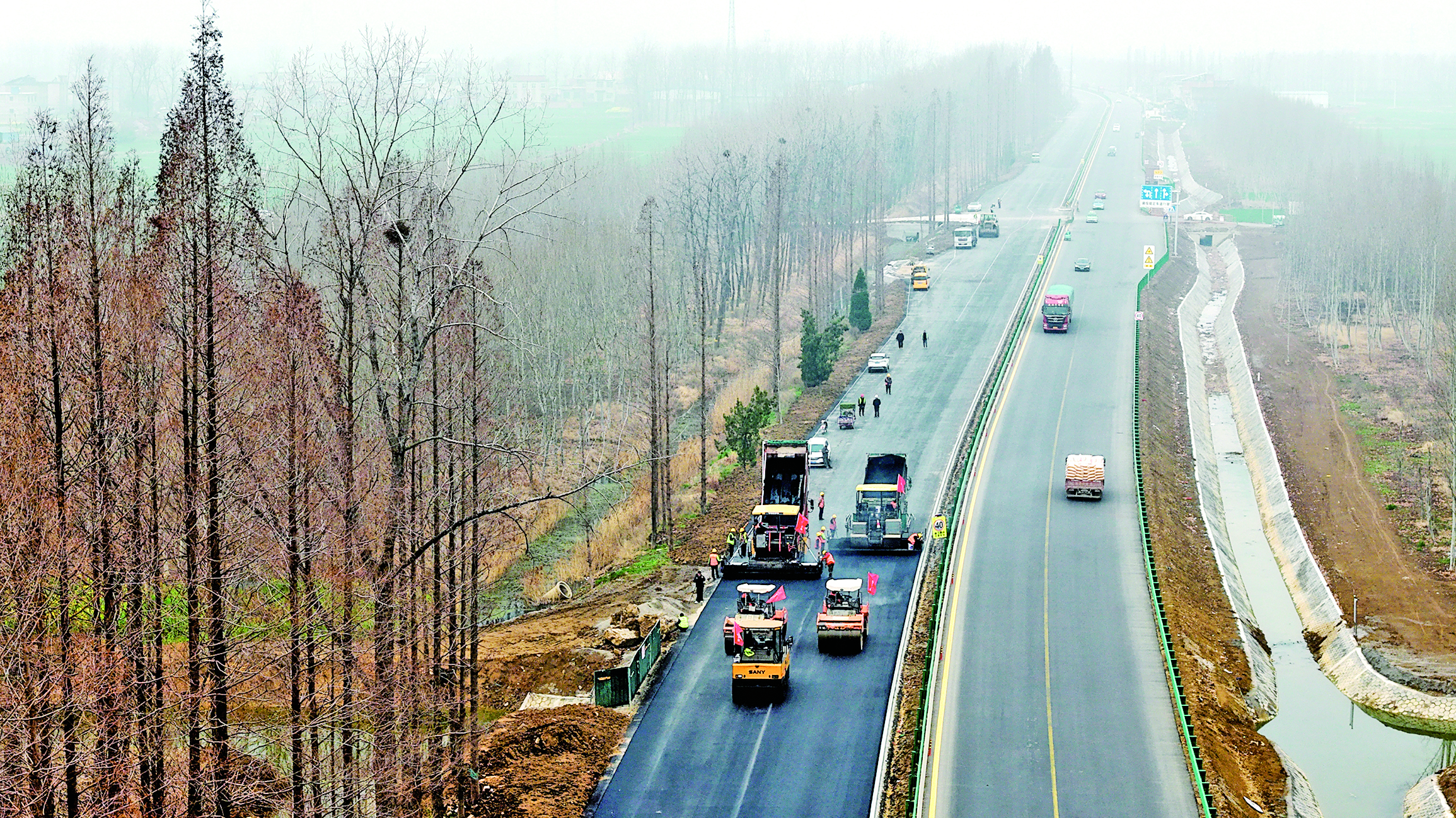 近日,S313头铺至大新段一级公路改建工程大新镇段,施工人员与工程机械紧密配合进行沥青摊铺。该工程起点位于头铺镇,顺接东段已建S313五河县南环路,向西南沿现状S313布线,沿线途经新集镇、大新镇,终点至费府寺,与东西向G329、蚌五高速浍南互通连接线形成十字交叉,路线全长约18.2公里。G329大新至沫河口段一级公路改建工程项目起点位于费府寺附近,顺接S313与G329交叉处,终点顺接S223与老G329交叉处,项目全线共10.4公里。据介绍,按照计划,项目六月底前完成路面主体工程,七月底完成绿化、机电等附属工程,八月份具备交工验收条件。(记者 刘晨 摄)