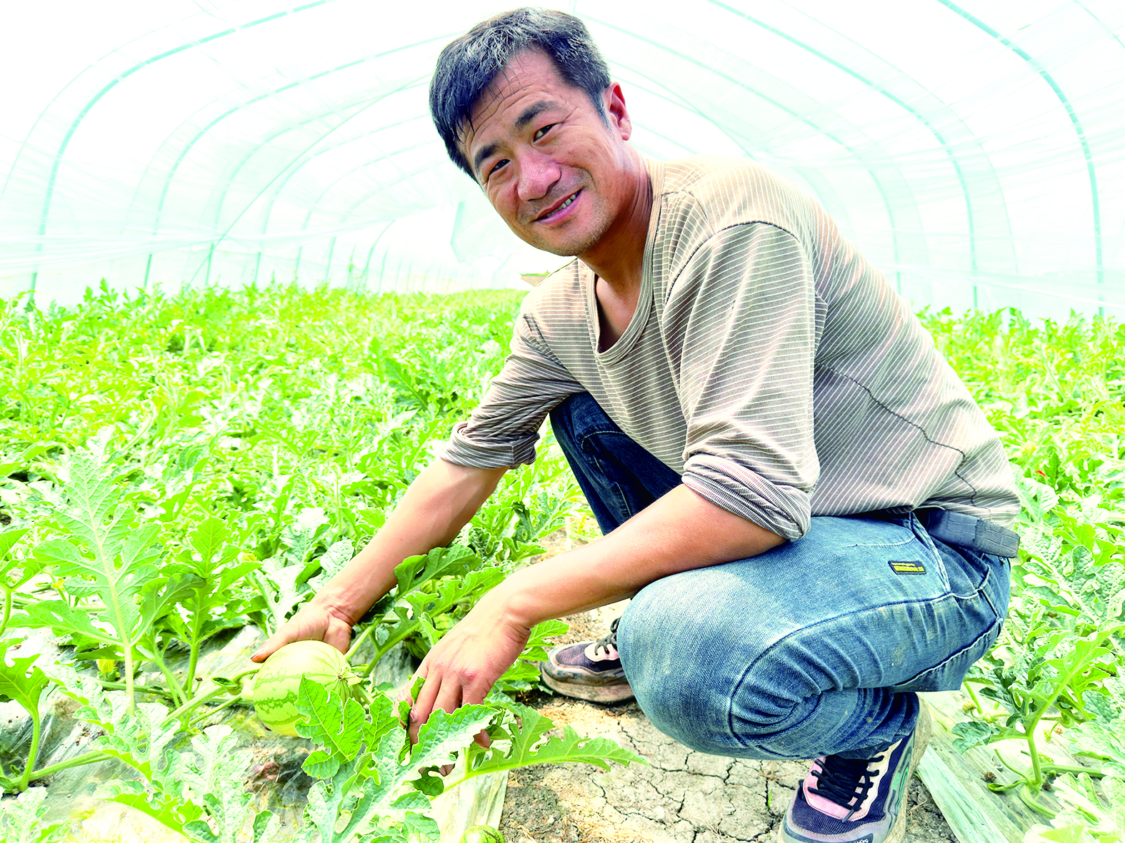 暮春时节,万物勃发。在固镇县石湖乡刘园村的西瓜种植基地,连片大棚绵延铺展,棚内翠绿的瓜藤顺着垄架肆意蔓延,一个个圆润饱满的无籽西瓜藏在叶间。种植大户顾士才蹲在瓜垄边,向记者讲述着他的种瓜故事。