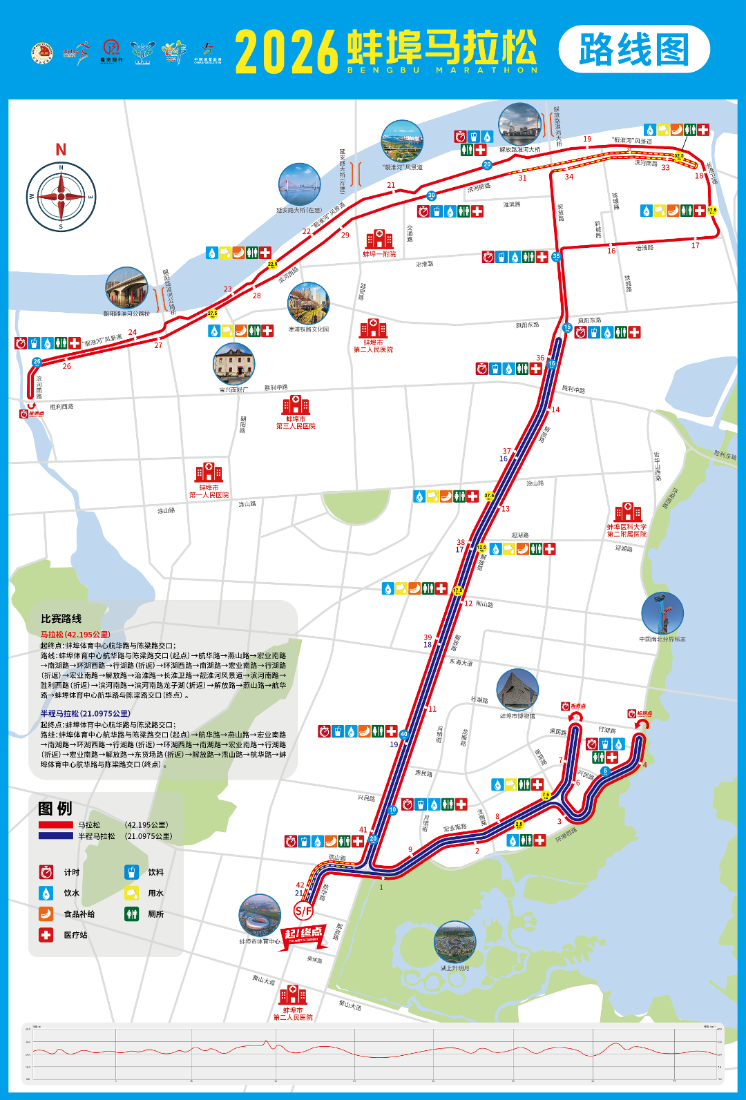 2026蚌埠马拉松赛道以“跑在南北分界,尽览蚌埠山水”为设计核心,赛事起点设在蚌埠体育中心,跑友们将一路途经蚌埠市博物馆、龙子湖风景区、靓淮河步道、朝阳路淮河公路桥、延安路大桥、解放路淮河大桥等众多城市地标与核心景点。