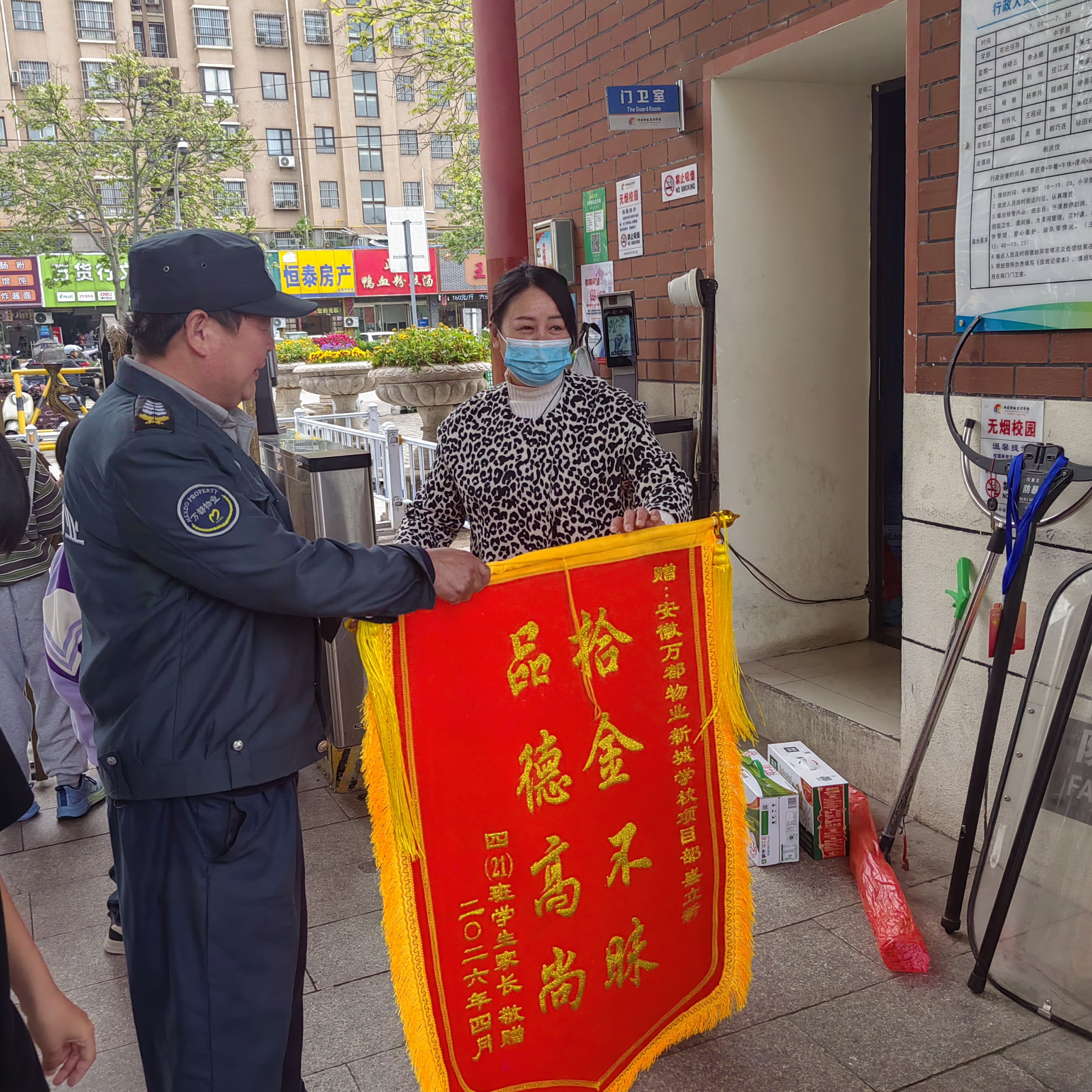 近日,蚌埠新城实验学校安保人员盛立新在南门执勤期间,捡到一条价值不菲的金项链。面对贵重财物,他第一时间妥善保管,并积极联系、核实信息,迅速将项链完好无损地归还给失主家长。(记者 周芳林 通讯员 盛昆 文/图)