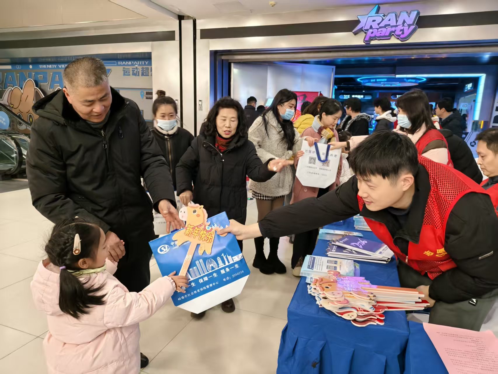 2月9日,活动继续深入蚌山区万达广场负一层,借助商场人流密集的特点,将社保宣传延伸至市民日常休闲场景。工作人员现场宣讲政策、书写春联、发放台历等新春礼品,吸引不少逛街市民积极参与,尤其马年卡通手举牌特别受到小朋友的欢迎。前来咨询的刘女士高兴地说:“本来只是逛商场,结果顺便了解了社保政策,还领到了小礼品,真的很开心。”