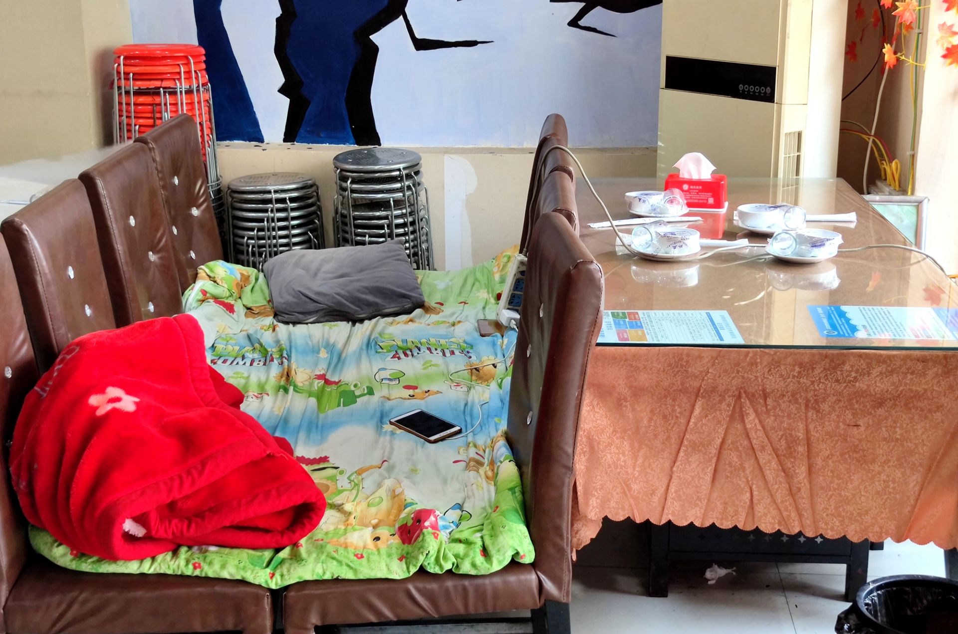 督查组最后来到一家叫“川味园”的农家土菜餐馆。只见店内张贴有食品安全公示栏,但未公示营业执照原件、未张贴文明餐桌、公勺公筷等文明标语。餐馆的食品安全公示信息栏,张贴了小餐饮信息公示卡,无食品经营许可证。在小餐饮信息公示卡经营项目内,仅有热食类食品制售一类,但在餐馆菜单上,出现了素拼、皮蛋等凉菜,属于超范围经营凉菜。同时,督查组人员在检查中发现,该店无法提供进货单据,也没有台账记录和索证索票等。餐厅大堂,四张椅子凑出一张“床”,上面铺着被褥,俨然成为一处睡觉歇息的地方。