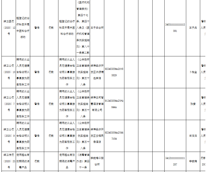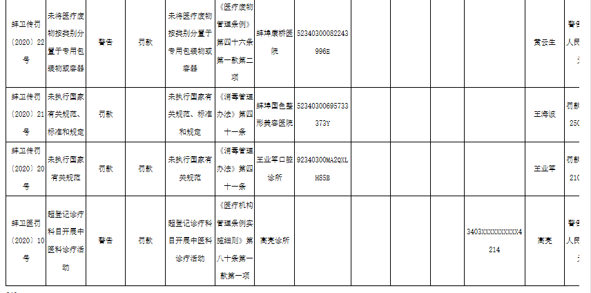 市卫健委公布一批行政处罚信息,因超登记的诊疗科目开展医学检验科诊疗活动、使用超出有效期限的消毒产品、将医疗废物混入其他废物、聘用的从业人员无健康合格证明从事直接为顾客服务工作等违规行为,禹花苑诊所、秦集镇东周村卫生室、龙子湖区解放街道建华社区卫生服务站、禹会区长青郑郢卫生站、王子兵诊所、经开区沐源精选宾馆、蚌埠云间智慧酒店管理有限公司、经开区云栖民宿酒店、李晓梅口腔诊所、蚌埠康桥医院、蚌埠国色整形美容医院、王业军口腔诊所、高亮诊所、经开区隐宿民居酒店被处罚。 蚌埠新闻网记者 张婷婷
