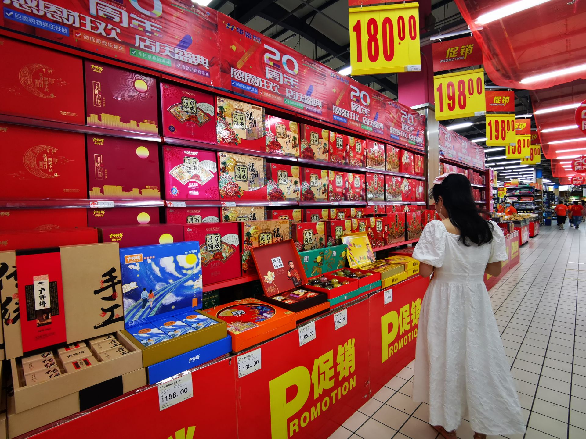 在淮河路一家超市的月饼区,各个品牌的月饼礼盒已经被摆在了货架上,色彩丰富、喜庆的礼盒让人感到浓浓的节日风已经扑面而来。