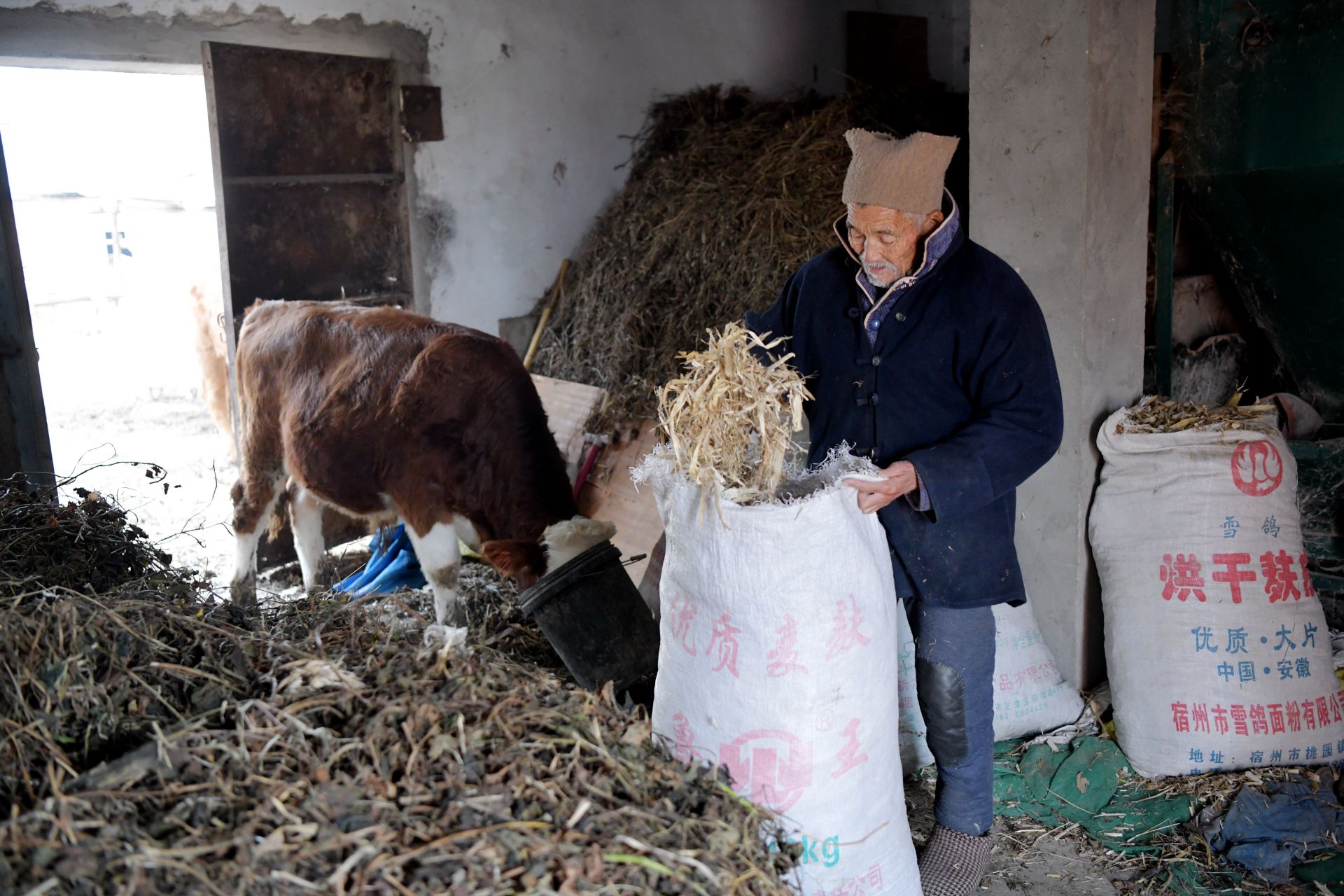天刚蒙蒙亮,在固镇县城关镇河东村,87岁的洪占凤就忙活着给老伴做饭、喂药。“得麻利些,天冷了,棚里的牛还等着俺喂食呢!”洪占凤说。