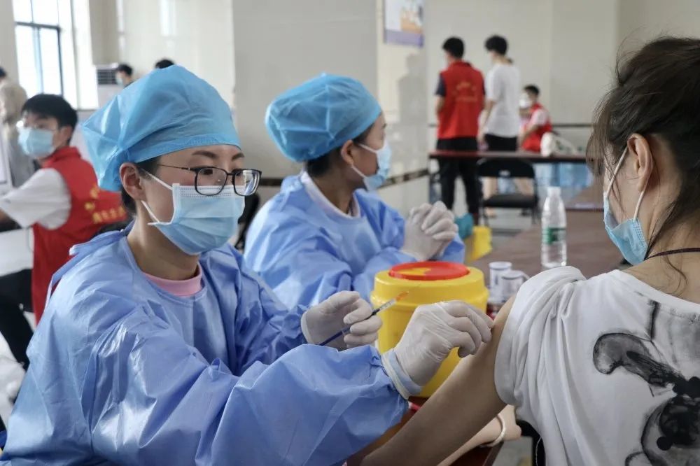 日前,在安徽财经大学接种点,市二院护士为大学生接种新冠病毒疫苗。