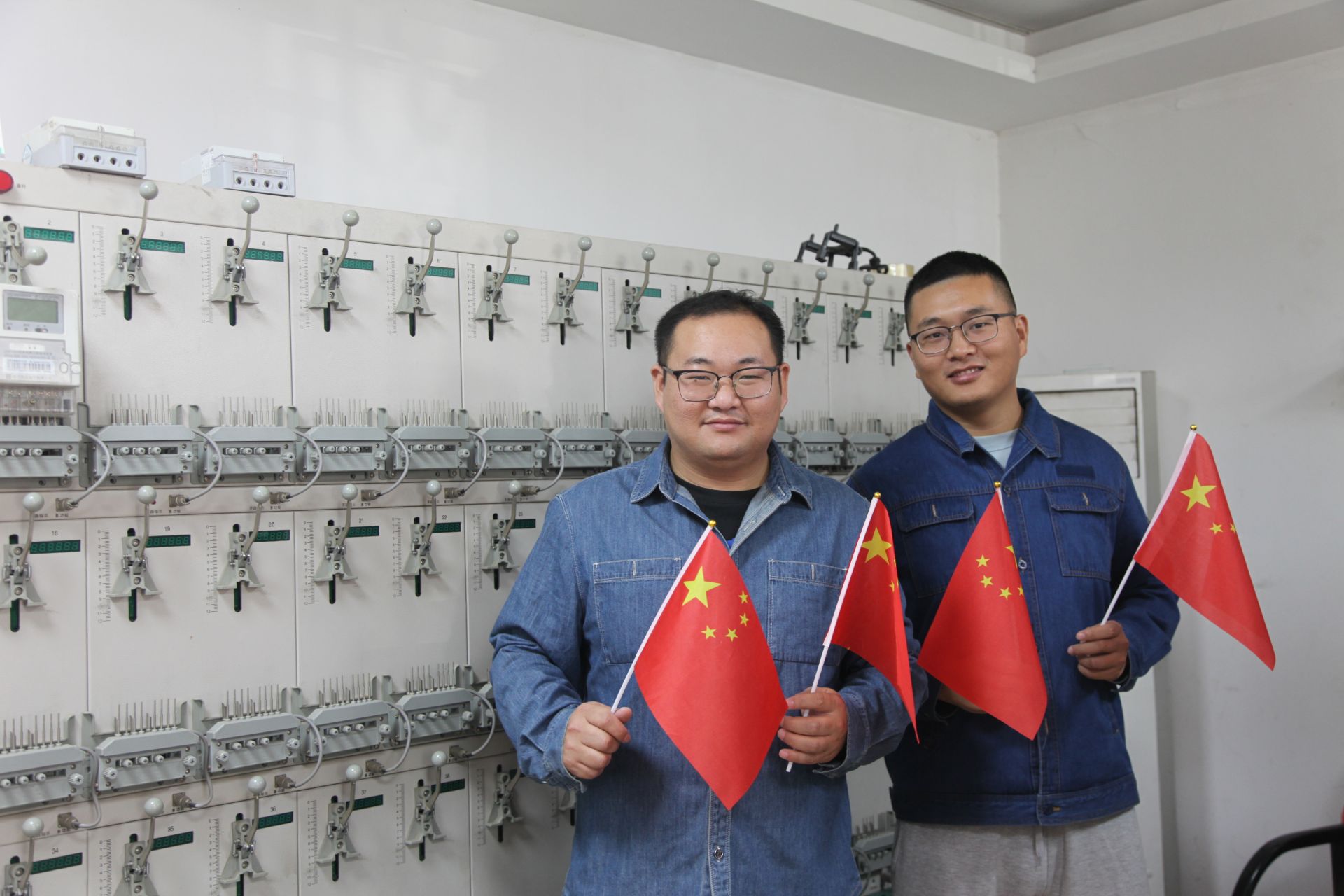 10月1日上午,国网五河县供电公司值班现场,一线员工欢庆国庆。(李振玉)