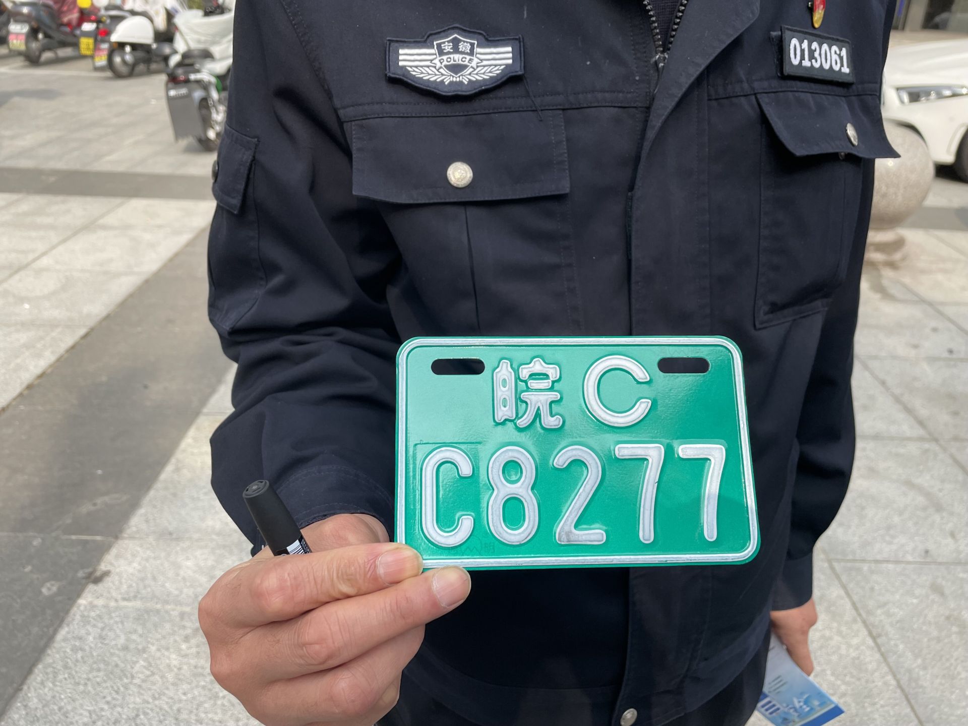 记者从交警部门了解到,新国标电动自行车上牌时,领取的是绿底白字号牌,如皖CE××××。超标电动自行车领取的是白底黑字、“皖C”为红字的临时通行标志,如皖CA××××。目前,市民办理电动自行车号牌233块,临时通行标志(临时车牌)1161块,共计1394块。
