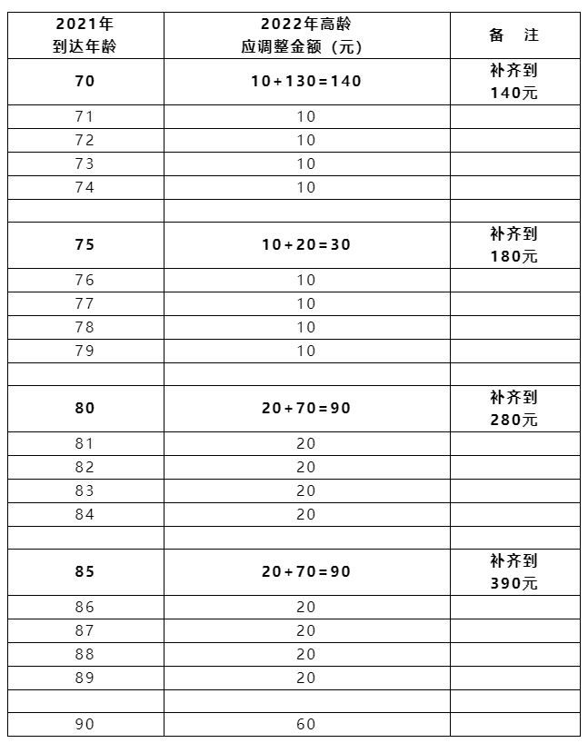 其中定额调整部分,每人每月增加39元;挂钩调整部分,实行与缴费年限和基本养老金水平“双挂钩”。具体来说,缴费年限在15年以内的(含15年),每月增加32元。缴费年限在15年以上的,自第16年起,每满1年每月再增加2.1元。同时,每人每月增加本人2021年12月基本养老金水平的0.5%;倾斜调整部分,继续完善我省高龄倾斜办法。截至2021年12月31日,年满70-79周岁的退休人员每人每月增加10元,年满80-89周岁的退休人员每人每月增加20元,年满90周岁及以上的退休人员每人每月增加60元。其中,对2021年到达70周岁、75周岁、80周岁、85周岁的退休人员,按照上述办法倾斜调整后,累计享受高龄倾斜部分低于140元、180元、280元、390元的补齐至上述标准。